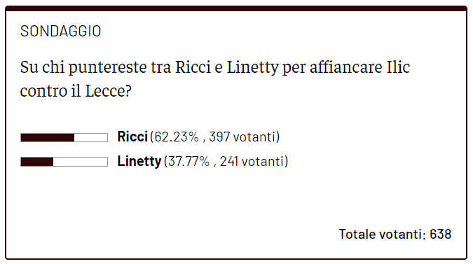 Ricci o Linetty per affiancare Ilic contro il Lecce? Lo abbiamo chiesto ai nostri lettori nel consueto sondaggio proposto da Toro News. Samuele Ricci ha recuperato dall'infortunio al soleo e ha scontato la squalifica rimediata nel derby, Karol Linetty però ha colto al balzo l'opportunità di sostituire l'azzurro ed è stato tra i migliori contro il Bologna. Nonostante questo, il 63% dei nostri lettori preferirebbe comunque rivedere titolare Ricci, un giocatore senza il quale i granata hanno spesso faticato. Ivan Juric va invece nella direzione opposta, come ha detto chiaramente in conferenza stampa senza lasciar spazio a dubbi: "Linetty ha fatto una partita spettacolare. Ricci sta ritrovando ora la forma migliore. Partiremo con Linetty e Ilic".