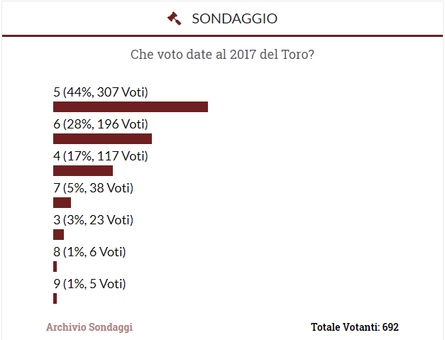 Inutile nascondersi: il Torino del 2017 è un passo indietro rispetto a quello che ci si aspettava. Almeno questo è quello che sostiene la maggioranza dei tifosi: nel sondaggio che Toro News vi ha proposto sul calare del 2017 in merito alla valutazione dell'annata, quasi un tifoso su due ha valutato in maniera insufficiente le prestazioni della squadra di Mihajlovic.