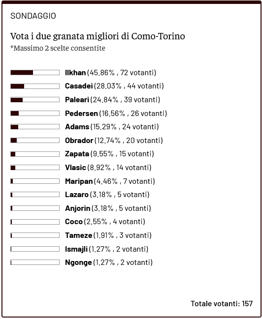 Il Torino cade rovinoamente allo stadio Sinigaglia di Como. Termina 6-0 il match fra i lariani di Fabregas e i granata di Marco Baroni. Abbiamo chiesto a voi lettrici e lettori di Toro News a votare i due migliori granata della sfida. Ilkhan è stato il migliore dei suoi contro il Como sabato. Ben il 45,86% dei votanti l'ha indicato come il migliore nella sfida contro i gialloblù. Al secondo posto c'è Casadei, che ha ricevuto il benestare del 28,03% dei votanti. Infine Paleari ottiene il 24,84%. Nella classifica generale Ilkhan sale a 22 scavalcando Maripan, Casadei a 14 e Paleari a 25
