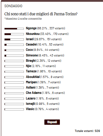 Dopo il match contro il Parma abbiamo chiesto ai lettori di individuare il miglior granata del match, per capire di chi, seppur dopo una serata dal risultato insoddisfacente, abbiate gradito la prestazione individuale. Col 66% dei voti Cyril Ngonge è risultato il miglior granata del match, ottenendo cinque punti. Alle sue spalle Nkounkou con il 33% delle preferenze, mentre completa il podio Franco Israel con il 29%.