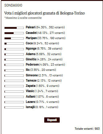 A chiudere in vetta tra le preferenze dei votanti è, come contro il Genoa, Alberto Paleari, con il 64,30% dei voti. A seguire Cesare Casadei, che entra per la prima volta in classifica in questa stagione con il 48,13% dei voti. Si piazza terzo Guillermo Maripan, con il 33,75% dei voti. La classifica complessiva vede ancora al primo posto Simeone con 17 punti; Maripan accorcia a meno cinque, mentre terzo è ora Paleari, con 10 punti.