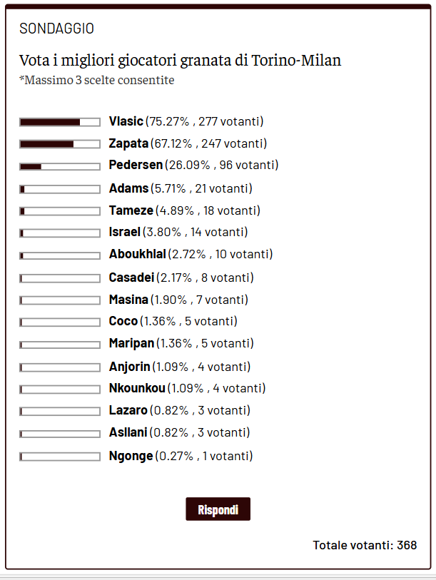 Come di consueto, al termine dell’incontro con i rossoneri vi abbiamo chiesto di votare i giocatori del Torino, a vostro parere, più meritevoli. Il risultato del sondaggio mostra un duo di testa che ha viaggiato in equilibrio, finché Nikola Vlašic è andato in volata con il 75,27% dei voti, staccando così Duvan Zapata, fermo al 67,12%. A completare il podio Marcus Pedersen con il 26,09%. La classifica vede ancora inscalfibile, dopo tre giornate di assenza, Giovanni Simeone a 20 punti. Alle sue spalle si presenta ora Nikola Vlasic in solitaria a quota 17. Terzi il trio Paleari, Maripan e Adams a 15 punti. Zapata sale a 6 punti, mentre Pedersen raggiunge quota 3.