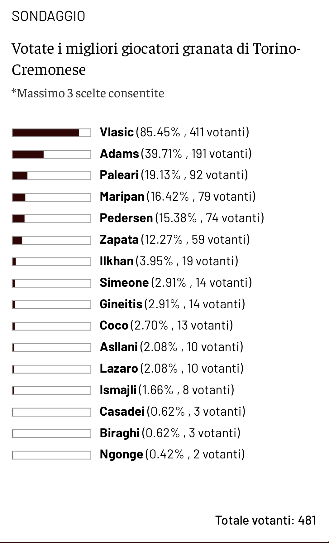 Il Torino torna a vincere contro la Cremonese dopo un periodo molto negativo, dove i granata avevano perso per tre gare di fila. La rete di Vlasic nel primo tempo spezza l'incantesimo e riconsegna i tre punti ai piemontesi. Una vittoria importante per il morale, ma soprattutto per la classifica. Vi abbiamo chiesto di votare i giocatori che ritenete più meritevoli sul rettangolo verde. Su un totale di 481 votanti, l’ 85.45% ha eletto Nikola Vlasic come migliore in campo nella sfida contro i grigiorossi. A seguire Che Adams, al secondo posto con il 39.71% dei voti. Si piazza terzo Alberto Paleari, con il 19.13% dei voti. La classifica complessiva vede ora al primo posto Vlasic con 22 punti che supera Simeone ora al secondo posto con 20 punti; conclude il podio Adams al terzo posto con 18 punti.