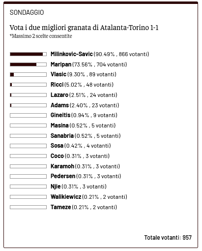 Il Torino porta a casa un punto contro l'Atalanta di Gian Piero Gasperini. Prosegue parallelamente anche il Toro News Award, il premio per il miglior calciatore granata che la redazione di Toro News assegna in base ai voti dei lettori. Contro i sardi il premio MVP va a Vanja Milinkovic-Savic, autore di una grande prestazione, condita dal rigore parato a Retegui nella ripresa. L'estremo difensore serbo ha ottenuto il 90,49% dei voti. Al secondo posto delle preferenze c'è Maripan, autore del gol del pareggio, con il 73,56%. Infine c'è Vlasic, anche lui autore di un'ottima gara e che ha ottenuto il 9,30% delle preferenze.