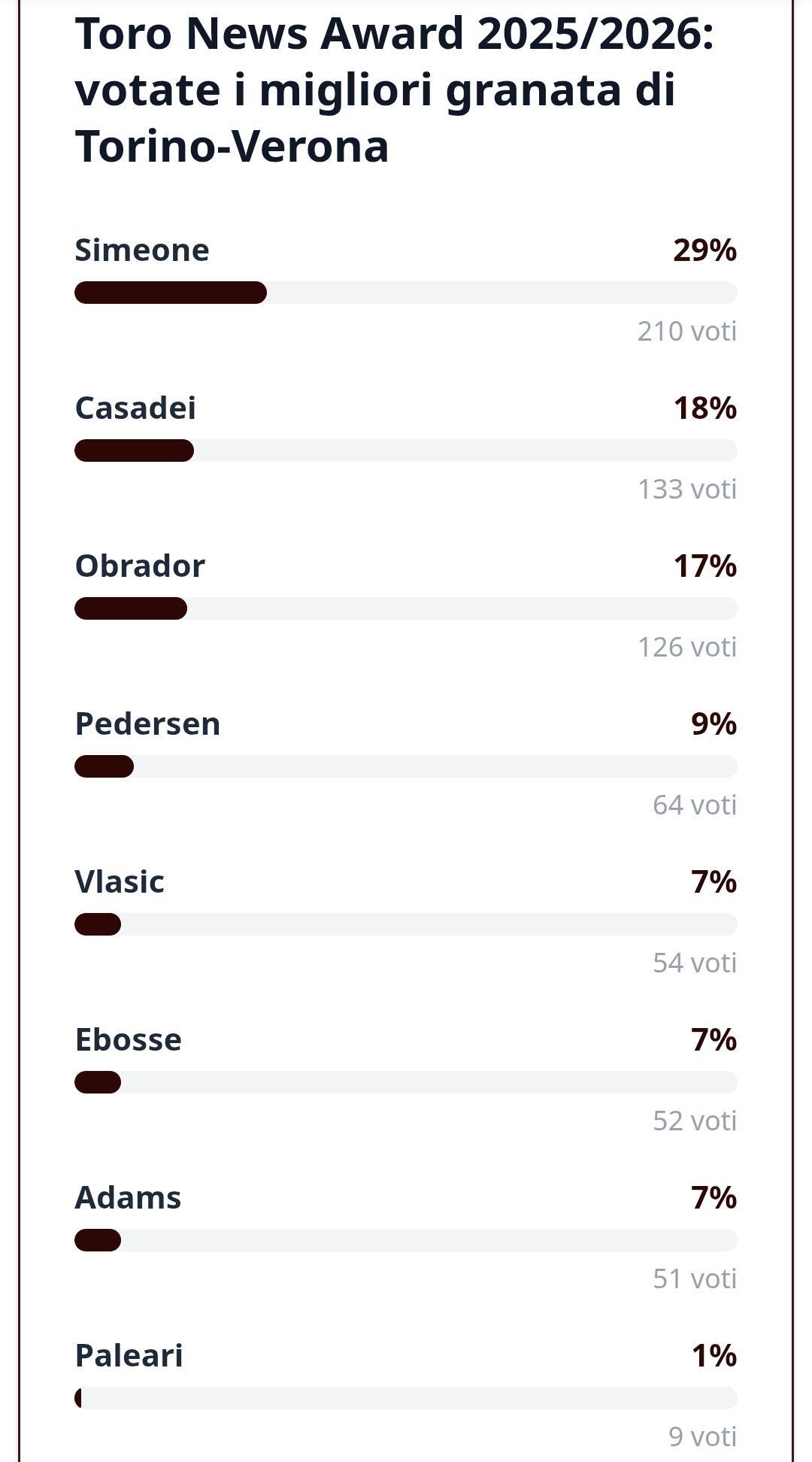 Il Toro vince allo Stadio Olimpico Grande Torino contro il Verona per 2-1. Una vittoria che significa salvezza per i granata, che salgono a 39 punti a +12 dalla zona retrocessione. Giovanni Simeone sblocca il match in avvio al 6' su assist di Marcus Pedersen, poi il gol di Kieron Bowie al 38' chiude il primo tempo in parità. Nella ripresa la rete di Cesare Casadei, la quinta in campionato, al 50', regala i tre punti al Toro. Abbiamo chiesto a voi lettrici e lettori di Toro News di votare i due migliori granata della sfida. Il Cholito Simeone è stato il migliore dei suoi contro il Verona. Ben il 29% dei votanti l'ha indicato come migliore contro gli scaligeri. Segue Cesare Casadei, che ha ricevuto il 18% dei voti, ottenendo il secondo posto per pochissimi voti davanti a Rafa Obrador. Lo spagnolo, infatti chiude il podio con il 17%. Nella classifica generale: Simeone sale a quota 36 punti, insidiando Emirhan Ilkhan, al momento secondo a 37, Casadei sale a 20, mentre Obrador si porta a 9 punti staccando Franco Israel.