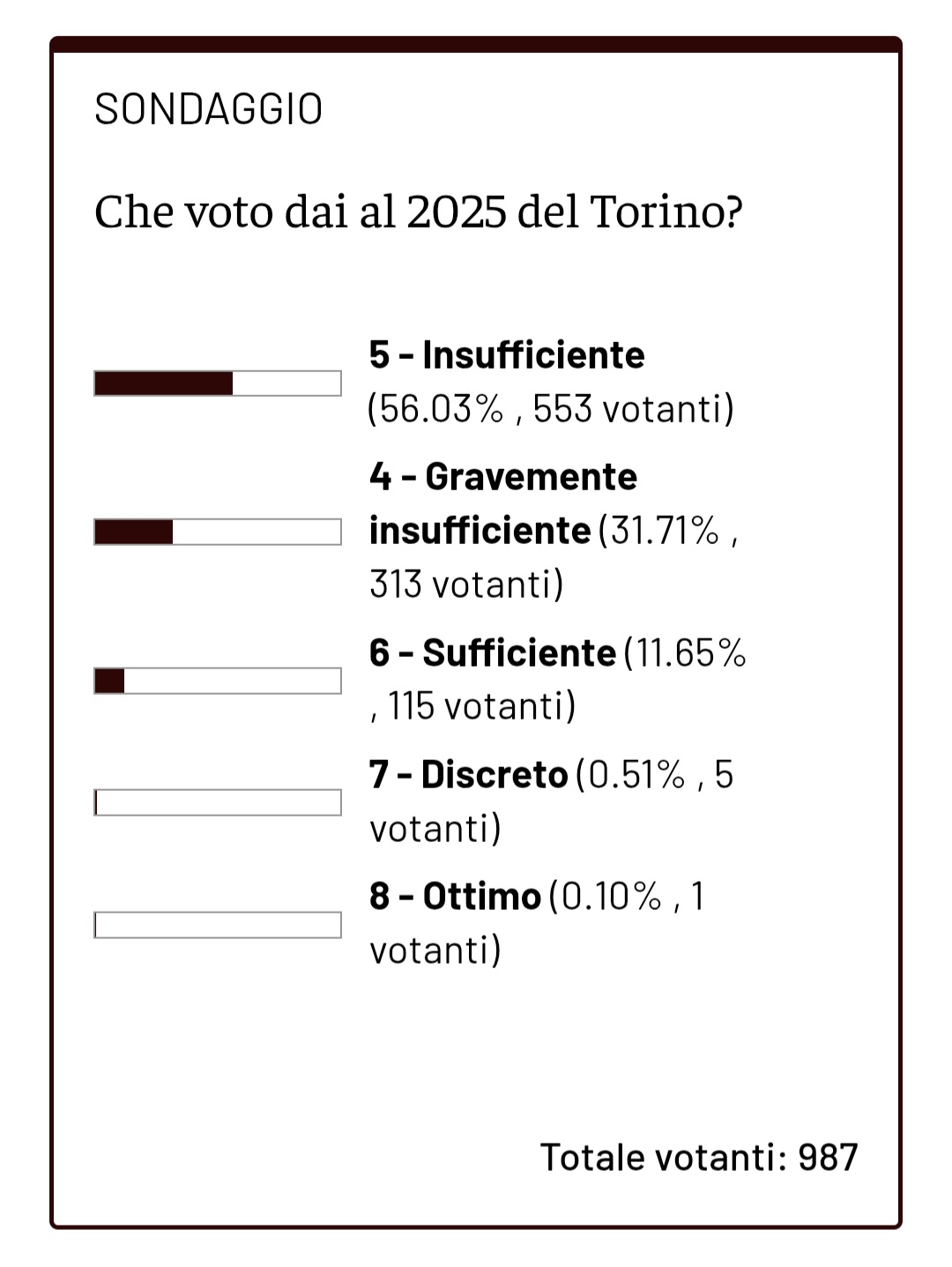 Dare un voto alla stagione del Torino è veramente complicato. I granata hanno alternato attimi di spirito ad altri periodi negativi, bui, che hanno abbattuto i tifosi. Alcuni eventi hanno caratterizzato l'anno granata, tra cui la salvezza ottenuta con anticipo nella scorsa stagione, con le speranze - disattese - di provare ad ottenere di più con Vanoli. L'esonero del tecnico, l'arrivo di Baroni, i cambi di modulo e il finale ritorno di Petrachi al posto di Vagnati. Tanti eventi differenti, con una colonna sonora comune: la contestazione dei tifosi nei confronti della presidenza di Urbano Cairo. Noi, come da tradizione, abbiamo chiesto a voi di dare un voto al 2025 del Torino, con una maggioranza ottenuta. Il 56% dei lettori di Toro News ha attribuito all'anno solare dei granata il giudizio "Insufficiente", con un voto pari a 5. Insufficienza, dunque, ma non grave: questa opzione ha comunque ottenuto un punteggio troppo alto, pari al 31,70%. Poco più del 10% di voi lettori, dunque, ha giudicato sufficiente la stagione del Toro. Un parere evidentemente condiviso da buona parte dei tifosi: per il 2026 il Toro deve fare meglio.