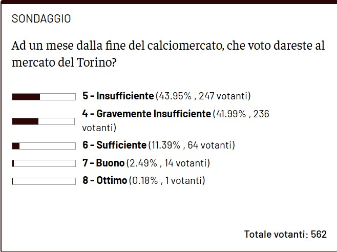 Nelle scorse ore qui su Toro News, abbiamo proposto un sondaggio molto chiaro in cui abbiamo chiesto ai nostri lettori di esprimere un loro parere sull'ultima sessione estiva di calciomercato. La domanda era di valutare con un voto il mercato condotto dal presidente Cairo e dal DT Vagnati dopo un mese dalla fine di quella finestra. Il risultato è stato piuttosto netto: meno del 15% dei tifosi ha dato un voto sufficiente a quest'ultimo mercato del Toro. Il voto più scelto dai nostri lettori è stato il 5 con il 43,95% che ha optato per questa insufficienza. Il 41,99% ha invece deciso di votare anche per il 4 che rappresenta una grave insufficienza. Meno del 15% dei lettori ha preferito assegnare un voto pari o maggiore al 6. Di seguito il riassunto completo di questi voti.