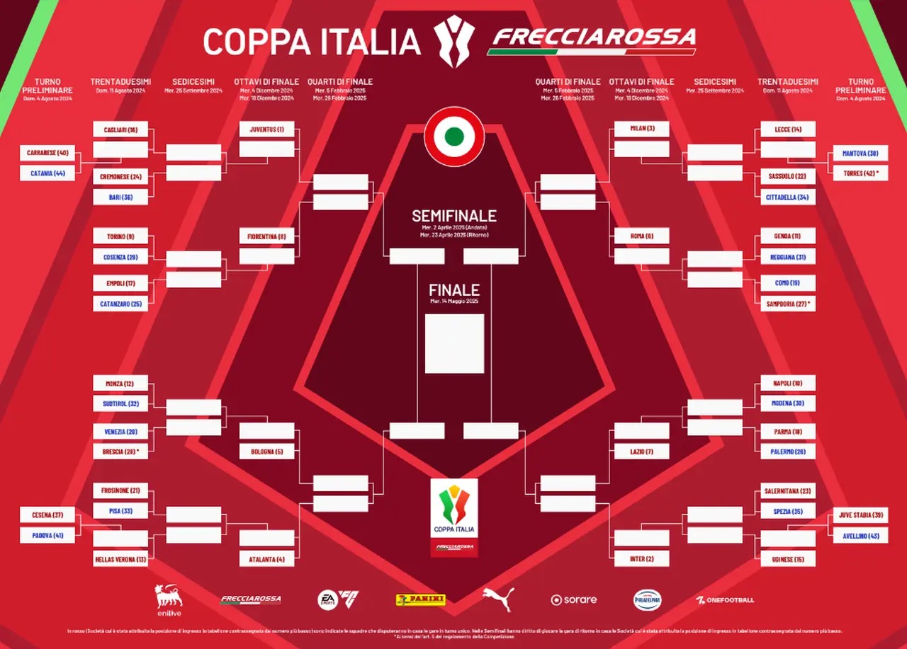 E' stato reso pubblico il tabellone ufficiale della Coppa Italia Frecciarossa 2024-25. Il Torino affronterà nel weekend del 10-11 agosto il Cosenza. Nella gara successiva, valevole per i sedicesimi di finale della competizione, ci sarà la vincitrice di Empoli-Catanzaro ad aspettare i granata, qualora uscissero vincitori dalla sfida con i calabresi. La data di questa partita dovrebbe essere mercoledì 25 settembre. Tra mercoledì 4 dicembre e mercoledì 18 dicembre ci saranno, invece, gli ottavi di finale. In caso di nuovo successo, i piemontesi dovrebbero vedersela con la Fiorentina. Infine, ai quarti ci potrebbe essere un'affascinante derby della Mole di Coppa Italia. Di seguito il tabellone completo.