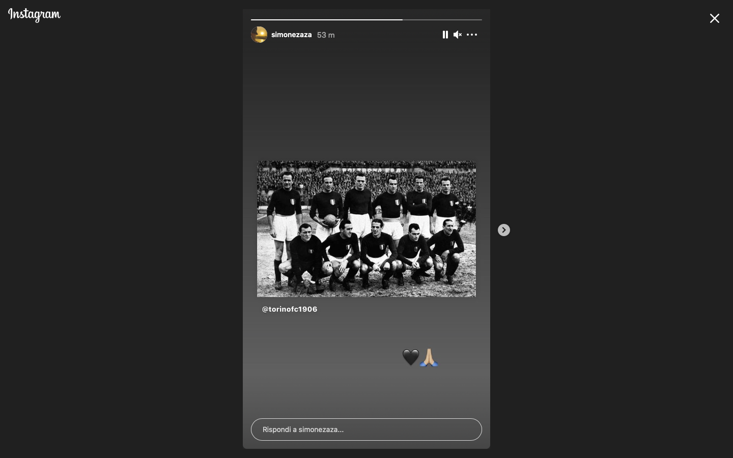 Storia dedicata al Grande Torino anche per Simone Zaza che ha condiviso sul proprio profilo il post dell'account ufficiale del Toro, accompagnato da un cuore e dalle mani unite in segno di preghiera.