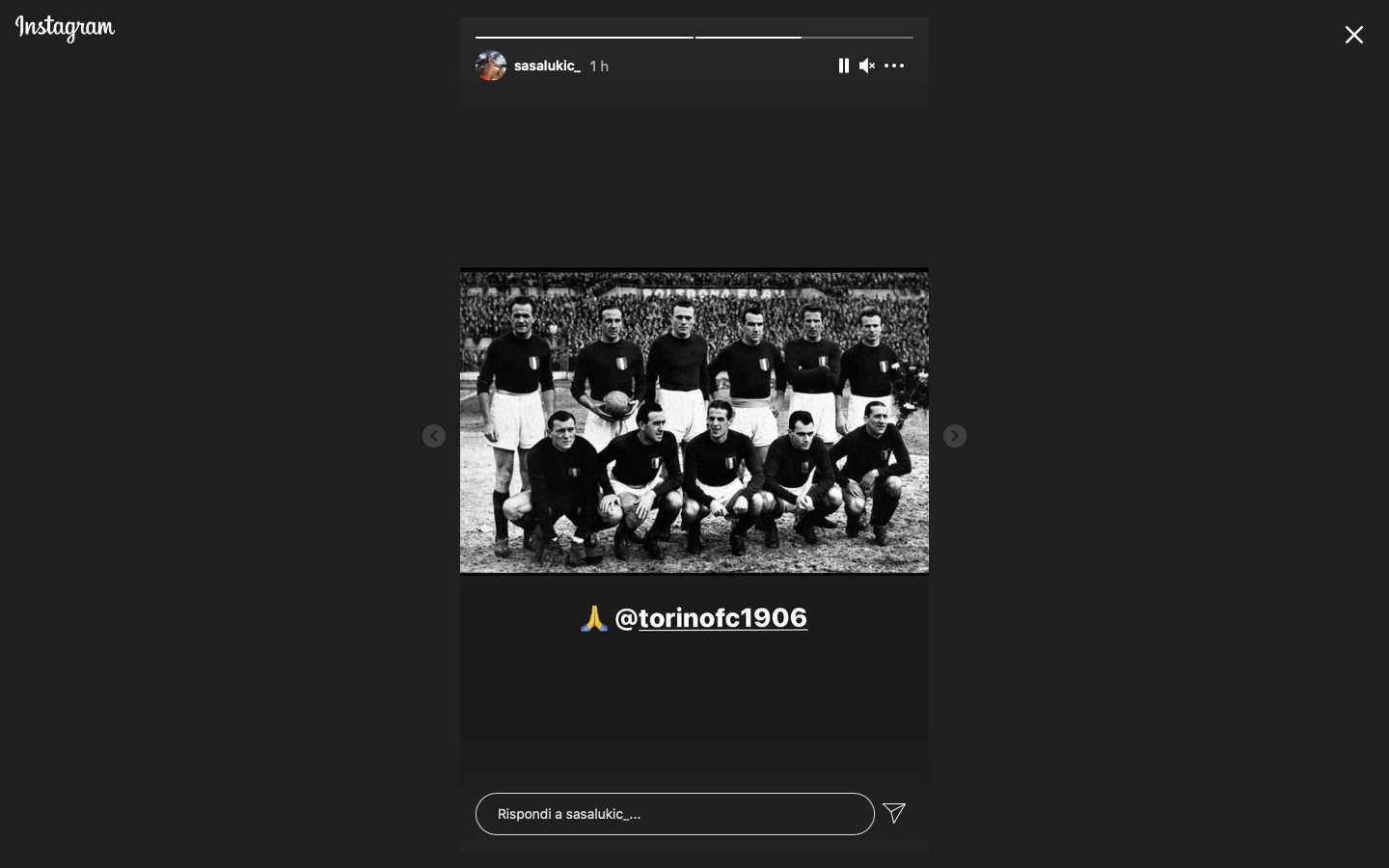 Il Grande Torino schierato, con lo stadio pieno alle spalle: anche Sasa Lukic, come Zaza, ha utilizzato l'immagine della mitica formazione granata nelle sue stories di Instagram.