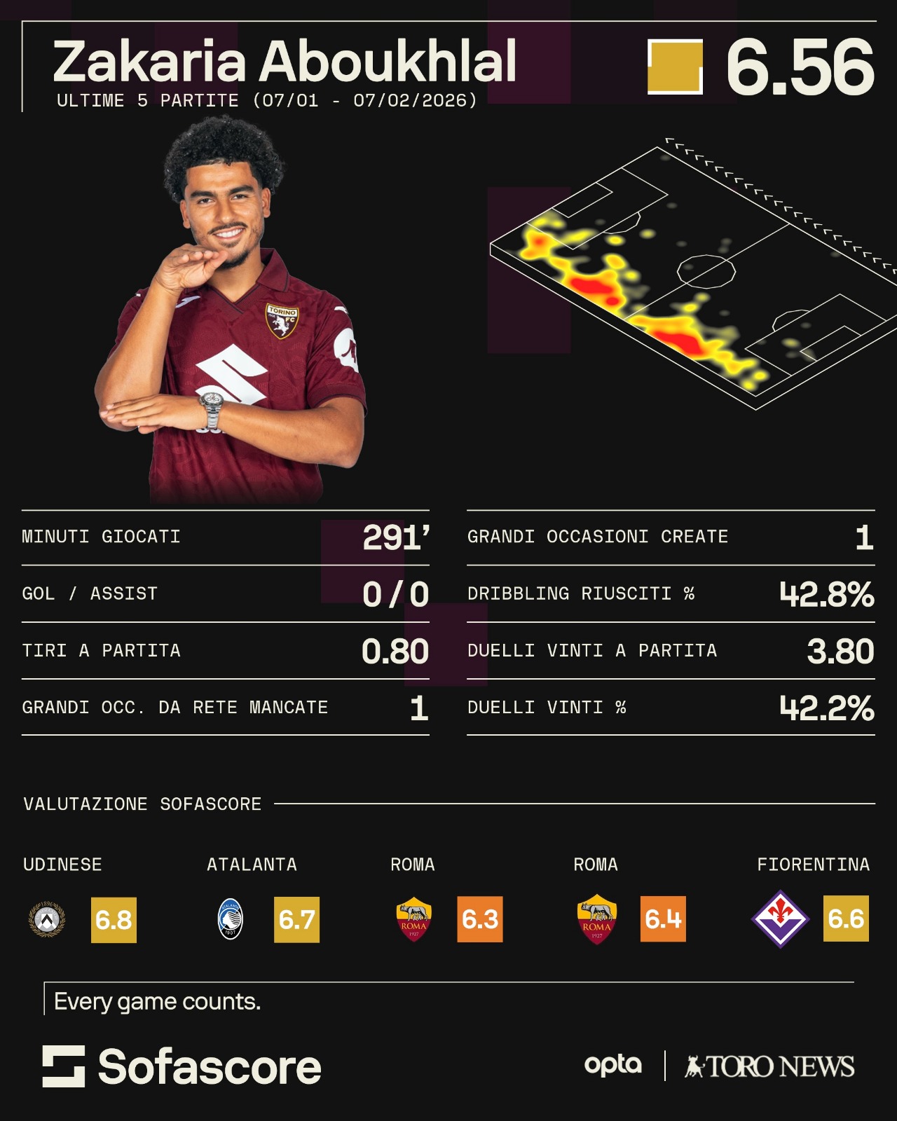 Arrivato, come detto, durante il calciomercato estivo del 2025 per la cifra di 8,5 milioni di euro, il classe 2000 ex Tolosa ha deluso fin qui con la maglia granata. Seppur qualcosa di buono si è intravisto, specie in avvio di campionato nella prima vittoria granata con la Roma per 0-1, l'infortunio occorso ad ottobre ne ha sicuramente pregiudicato il rendimento. Infortunio che non vuole essere una scusante, ma che ha sicuramente ritardato l'adattamento ad un campionato di diverso spessore rispetto a quello francese. Dopo i problemi fisici di fine 2025, il numero 7 granata sembra quanto meno aver ritrovato una certa continuità, con le ultime 5 partite disputate dal Toro che lo hanno visto scendere in campo per 4 volte da titolare. Il cambio di ruolo poteva essere un modo per cercare di aiutarlo a tornare importante ma solamente a sprazzi il suo apporto è stato prezioso. Lo confermano anche i dati sul rendimento del marocchino nelle ultime 5 gare tra campionato e Coppa Italia, a partire dallo scontro con l'Udinese fino a quello con la Fiorentina.