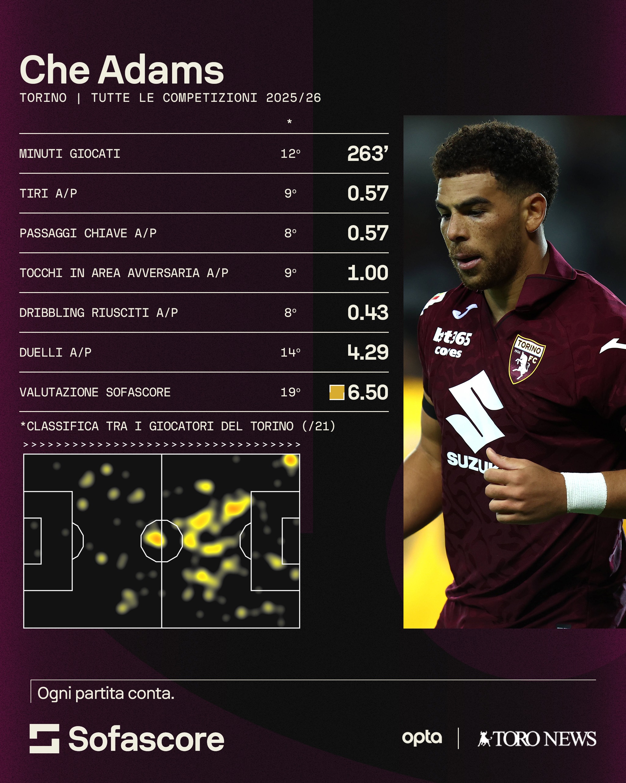 —In questi primo mese e mezzo di stagione invece si contano sette presenze per Adams di cui cinque in campionato ma nessuna da titolare e le altre due sono arrivate in Coppa Italia quando è sceso in campo dal 1' ma venendo sostituito al 60' e al 65'. Per il numero 19 granata si sta dimostrando molto difficile riuscire a imporsi in questo inizio di seconda annata al Toro e infatti è ancora a quota zero gol e zero assist. Come si evince dalle statistiche di SofaScore, sono però anche altri i dati negativi per lo scozzese che ha una media 0,57 tiri a partita e appena un tocco di media nell'area avversaria. Per lui anche poca ispirazione nei dribbling fin qui visto che gliene sono riusciti lo 0,43% da agosto a oggi. Il tecnico Marco Baroni gli ha concesso poco spazio fino a questo momento e lui non riesce e far vedere le sue ottime doti messe in mostra l'anno scorso.
