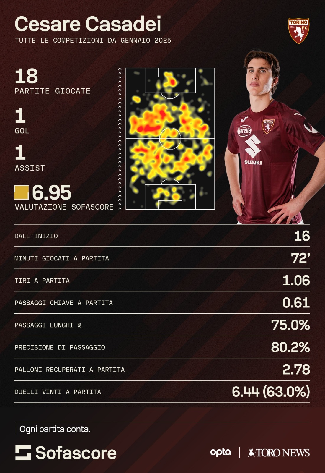 —Negli ultimi giorni dello scorso mercato invernale, il Torino piazzava ufficialmente l'acquisto di Casadei che veniva giudicato un ottimo colpo per il presente ma soprattutto per il futuro. Cairo e Vagnati per chiudere quest'operazione con un club blasonato come il Chelsea avevano dovuto superare l'agguerrita concorrenza della Lazio che ha trattato a lungo con la società londinese e con l'entourage del giocatore. Nelle prime partite all'ombra della Mole, Casadei si era subito messo in mostra con un gol e con prestazioni di livello in mezzo al campo e nelle mediana a due uomini che disegnava l'ex allenatore Paolo Vanoli. Come si evince dai dati e dalla heatmap di SofaScore, il numero 22 granata spazia molto per il campo, muovendosi sia sulla destra che sulla sinistra e ha tenuto una media dell'80,2% di passaggi riusciti oltre ad aver recuperato 2,78 palloni per match. Tuttavia, dopo questo positivo apporto iniziale, il centrocampista classe 2003 ha iniziato a calare di ritmo già nella passata stagione.