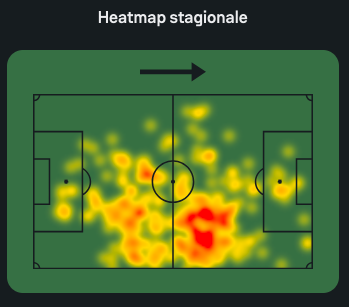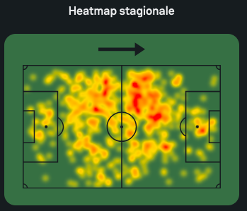 Questa heatmap fa riferimento alla stagione 2024/25, con Paolo Vanoli in panchina. Si nota chiaramente come Casadei fosse un giocatore a tutto campo, coinvolto in entrambe le fasi di gioco. Ancora più evidente risulta il suo apporto in zona offensiva, con aree più scure presenti anche all’interno dell’area di rigore, segno di una maggiore presenza negli ultimi metri.
