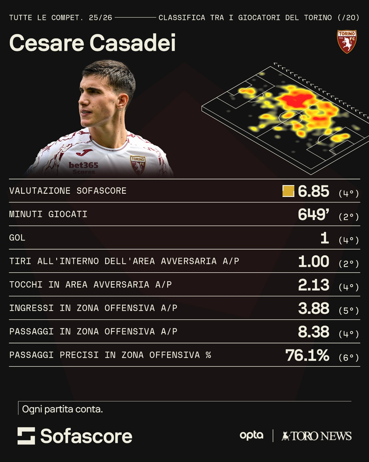 La presenza di Casadei in fase offensiva c’è, ma dà la sensazione che le “catene” tattiche a cui è ancorato nella propria metà campo gli impediscano, in qualche modo, di esprimersi al meglio. I numeri non sono negativi in senso assoluto, perché mostrano come il giocatore provi a farsi vedere in avanti, come si evince dalla sua scheda su SofaScore. Tuttavia, non spiccano: anzi, lo collocano in quel limbo poco gratificante della metà classifica. È quinto tra i giocatori del Toro per ingressi in zona offensiva e sesto per precisione nei passaggi nella stessa area. Non si tratta di statistiche disastrose, ma non abbastanza per considerarlo un leader tecnico del centrocampo granata. Probabilmente il rendimento è anche condizionato dalle difficoltà del Torino sul piano offensivo, ma al momento il suo apporto complessivo non può essere definito realmente impattante.