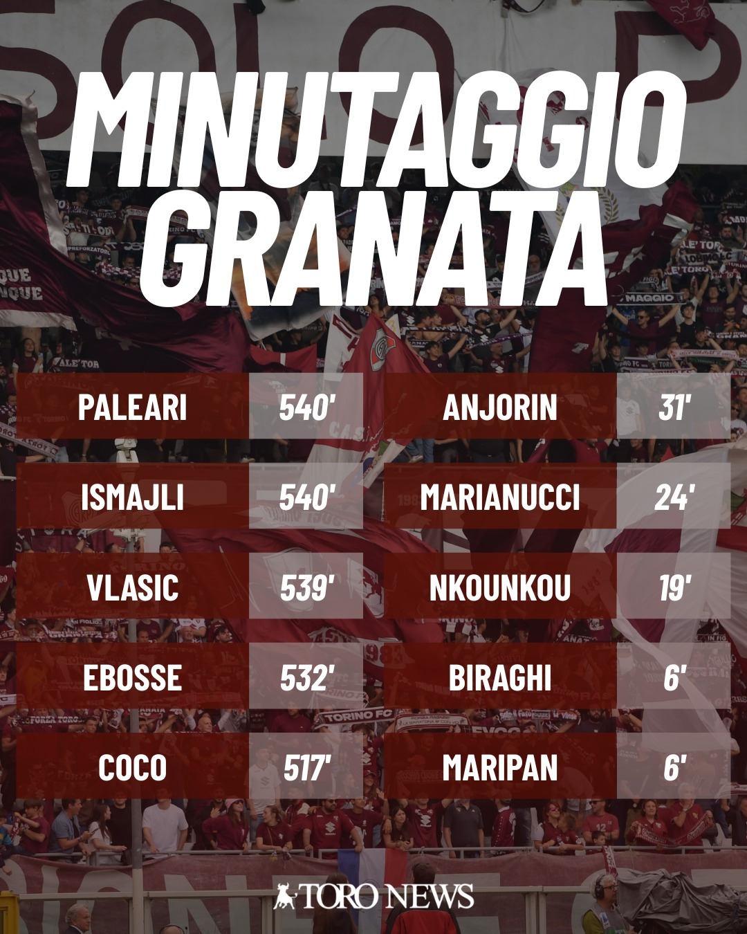 In difesa D'Aversa ha regalato l'esordio a Maripan, che ora conta 6 minuti, mentre Marianucci ai 23 contro il Verona ne aggiunge 1 contro il Parma. Sugli esterni Biraghi evidenzia un minutaggio analogo al cileno, mentre Nkounkou ha giocato soltanto 19 minuti tra Lazio e Milan. In centrocampo il protagonismo di Gineitis e Vlasic lascia spazio soltanto a un altro posto, conteso tra Ilkhan (103 minuti in due partite e 0 nelle altre quattro), Prati (317 minuti spalmati tra tutte le sei partite) e Casadei (assente solo contro il Parma, mentre nelle altre cinque ha collezionato 174 minuti). Anche Ilic, Tameze e Anjorin si aggiungono al computo: il primo con i soli 22 minuti contro la Lazio (panchina nelle successive cinque), il secondo con 5 minuti contro la Lazio e 7 contro il Pisa, il terzo con 31 minuti spalmati tra Napoli, Parma e Pisa. In avanti sono Adams, Zapata e Kulenovic ad alternarsi la titolarità al fianco di Simeone: lo scozzese è sceso in campo dal 1' contro Parma e Verona, il colombiano contro Lazio, Napoli e Milan, il croato contro il Pisa. Il minutaggio è simile per i primi due (224 minuti Adams e 222 Zapata) mentre scende un po' Kulenovic: 120 minuti. Alla fine di questo conteggio, tre giocatori rimangono a zero: Israel, Njie e Aboukhlal, quest'ultimo complice un infortunio importante. Troveranno spazio da qui alla fine?