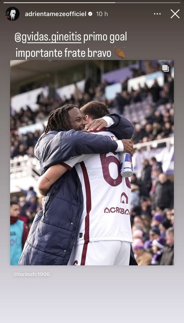 Adrein Tameze - compagno di reparto di Gineitis - lo esalta sui social. Il numero 61 granata sul suo profilo Instagram ha postato infatti tra le sue storie una foto mentre abbraccia l'autore del gol scrivendo: "Primo goal importante frate bravo".