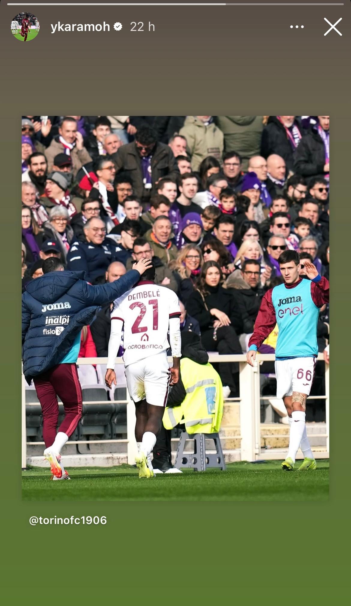 L'esterno ivoriano Yann Karamoh sul proprio profilo Instagram ha pubblicato una foto per mostare vicinanza a Dembele, espulso nel primo tempo del match. A seguire la foto sul profilo Instagram di Karamoh.