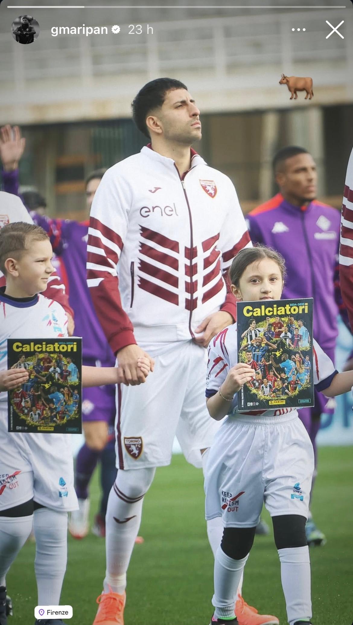 Il difensore cileno Guillermo Maripan ha condiviso su Instagram una foto che lo ritrae mentre fa il suo ingresso in campo sul terreno del Franchi con l'emoji del Toro. A seguire la foto condivisa dal giocatore su instagram.