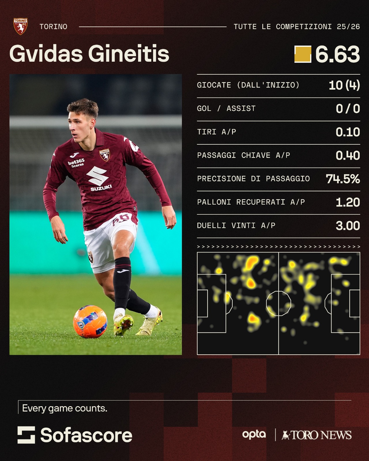 Le statistiche visibili nella grafica fornita da Sofascore mostrano proprio questo aspetto: in un centrocampo in cui è affidato a Vlasic il compito di creare gioco offensivo e al regista, Asllani o Ilic, il compito di impostare, le mezzali devono anche - e forse soprattutto - garantire quantità in mezzo al campo. Gineitis è un giocatore che sa fare questo lavoro e non solo: in Nazionale è di fatto punto cardine sia per la fase difensiva che per quella offensiva. Finora, però, con la maglia granata ha faticato a rendere al meglio, mostrandosi inconsistente: questo è evidente sì dai dati sui tiri e sui passaggi chiave a partita, rispettivamente 0,10 e 0,40, ma in realtà soprattutto dagli 1,20 palloni recuperati a partita e dai 3 duelli vinti in media ogni match. Il lituano non eccelle in nessuna fase e questo lo fa scendere molto, come è stato evidente, nelle gerarchie di Baroni.