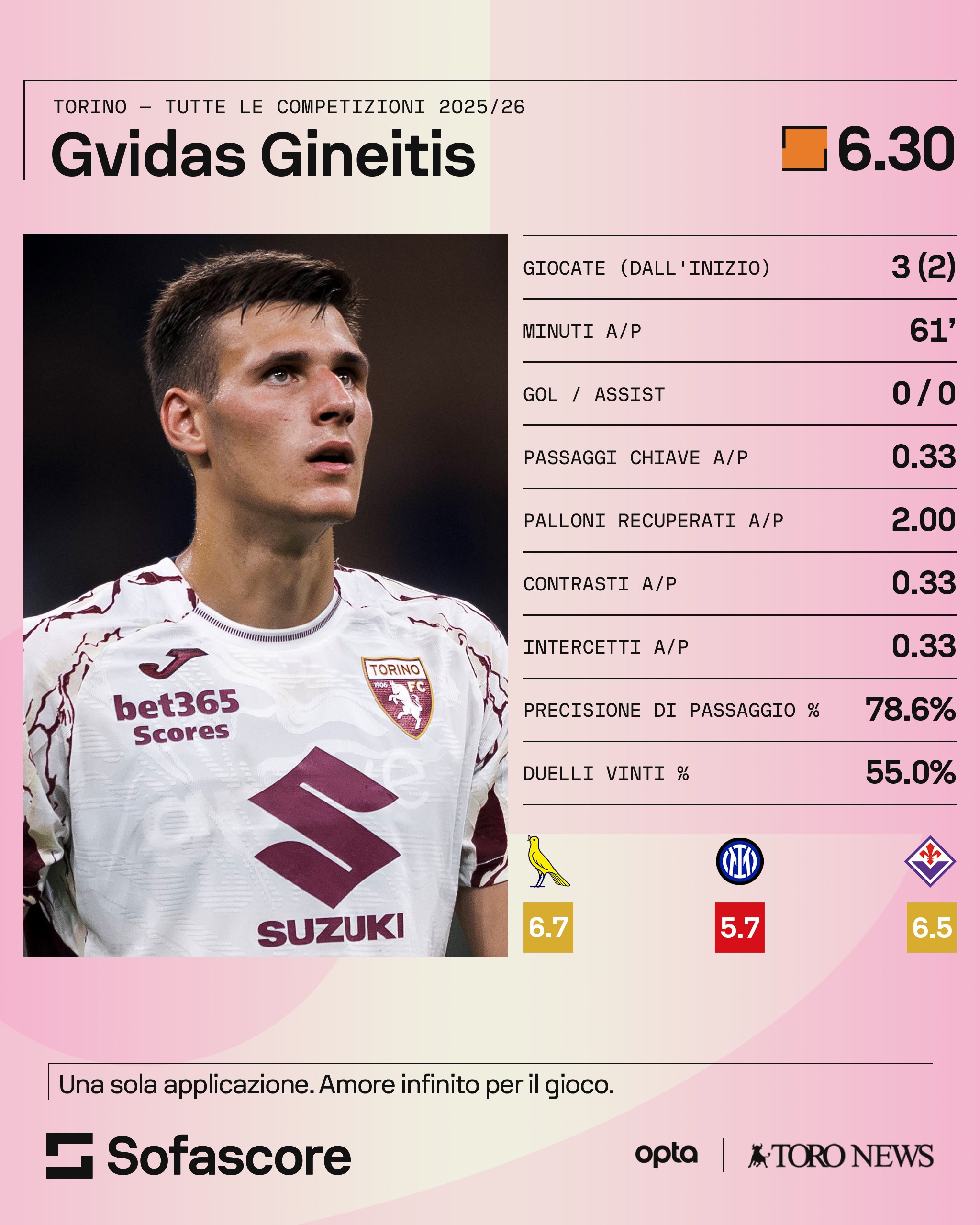 —Fino a questo momento Gineitis non ha brillato è vero, nelle sue tre presenze stagionali ha avuto una media del 55% di duelli vinti e solo anche 0,33 contrasti per partita. Come si evince dai dati di SofaScore, però ci sono anche delle statistiche incoraggianti per la mezzala classe 2004 come la precisione dei passaggi del 78,6% e la media di 2 palloni recuperati per gara. Il lituano del Toro deve cercare di ripartire da queste sue caratteristiche per mettersi in luce e sperare che Baroni gli conceda una nuova chance, magari già nel match di sabato contro la Lazio, ovvero su un campo dove lui l'anno scorso fece un gol molto importante per evitare la sconfitta ai granata. Per lui potrebbe essere utile un passaggio al 3-5-2, modulo che permetterebbe di schierare un centrocampista in più e che darebbe a Gineitis l'opportunità di giovare da mezzala di inserimento che è la posizione in cui si esprime meglio. Si tratta di un'eventualità possibile e su cui potrebbero esserci degli sviluppi nelle prossime partite anche se il rischio sarebbe quello di sacrificare i parecchi esterni d'attacco presenti in rosa ma come detto all'inizio i continui cambi di modulo estivi hanno lasciato qualche perplessità nella creazione dell'organico del Torino.