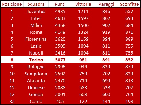 Forse, in effetti, il Toro è la squadra che ha di più da recriminare. Però i sogni e le pretese che i tifosi reclamano e per la cui mancanza contestano, sono solo in parte giustificati da questo dato. La classifica perpetua della Serie A va a sommare tutti i punti, le vittorie, i pareggi e le sconfitte conseguite dai vari club nella loro storia. Una classifica che unisce periodi storici differenti, che - nel caso del Toro - fanno una grande differenza: in alcuni periodi il Torino è stato la squadra più forte d'Italia, in altri ha faticato persino in Serie B. Unire i vari momenti della storia granata e farne un'unica grande classifica permette, almeno un minimo, di comprendere se la situazione in cui attualmente si trova il club granata è giusta. Oppure, potrebbe anche essere che abbiano ragione i tifosi e il Toro meriterebbe di stare molto, ma molto più in alto.