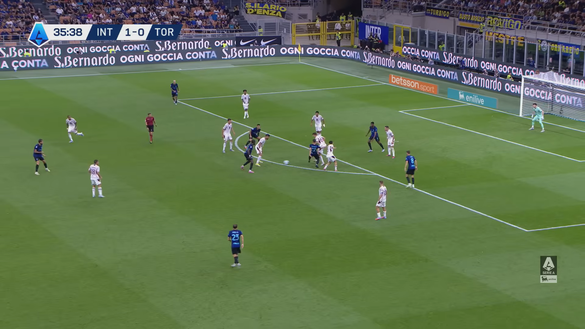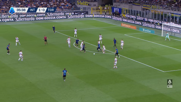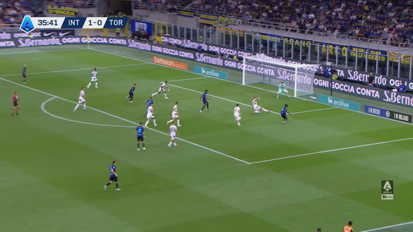 A quel punto il numero 8 dell'Inter alimenta velocemente l'azione e premia l'inserimento in area di Thuram che ha visto la difesa del Toro molto mal posizionata (immagine 3).