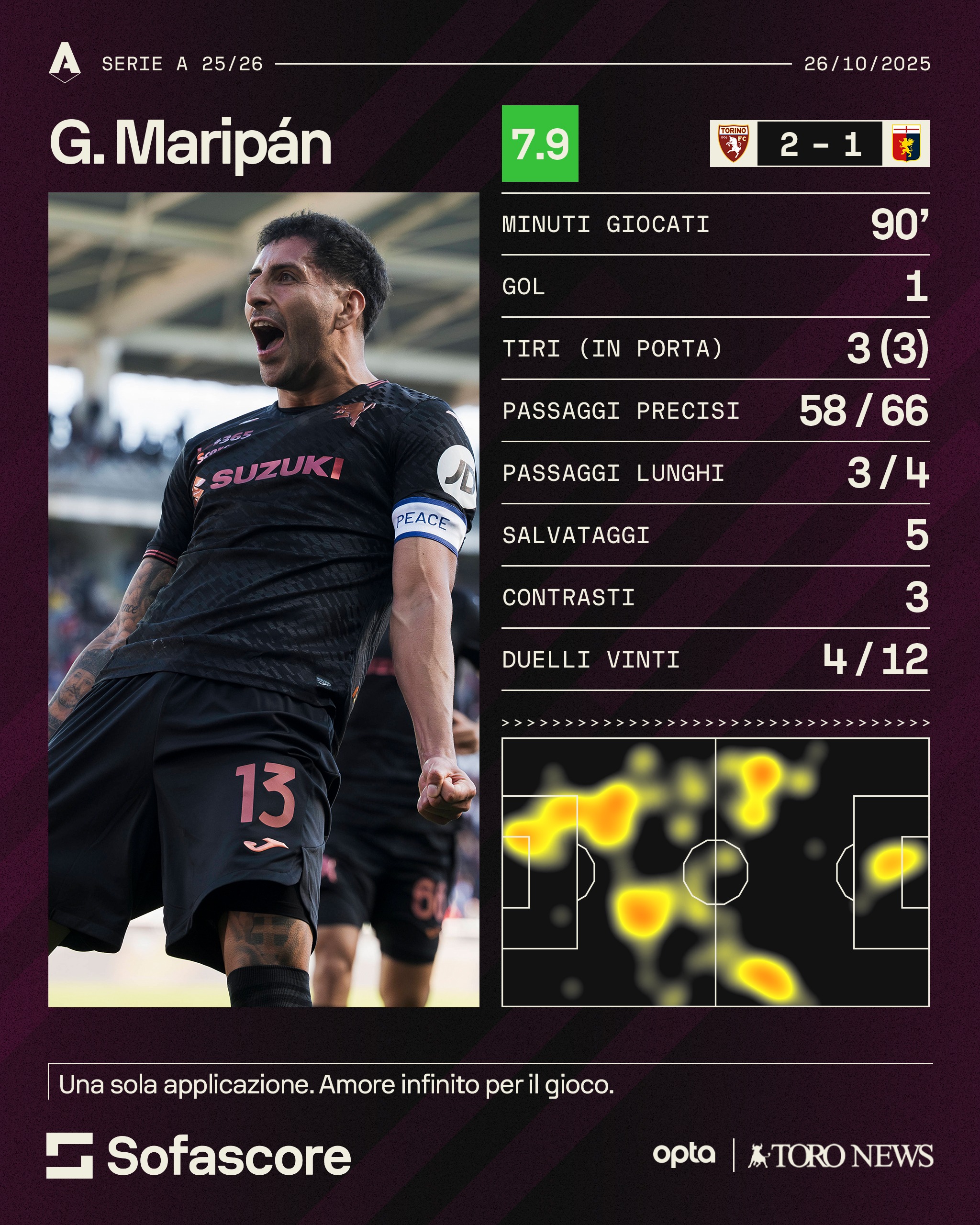 Maripan è l'eroe di giornata insieme a Paleari. Il difensore cileno ha realizzato con un tiro al volo una rete di pregevole fattura, permettendo ai granata di ottenere i tre punti, arrivando alla seconda vittoria consecutiva e ai sette punti conquistati nelle ultime tre partite. La copertina della partita è proprio l'esultanza del cileno, che dietro trova, però, 90 minuti giocati non con l'eccellenza alla quale l'ex Monaco ha abituato il proprio pubblico. O meglio, non nella consueta maniera. Nella prestazione di Guillermo Maripan contro il Genoa c'è stata una grande tendenza a supportare la manovra di costruzione e quella offensiva, talvolta abbandonando il proprio posizionamento lasciando quindi alcuni spazi sfruttabili dagli avversari. I dati fanno emergere proprio questo aspetto.