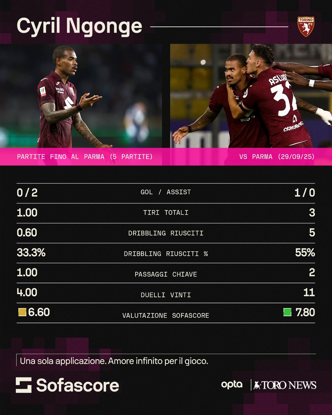 —Sembra più che riassuntiva la grafica realizzata da Sofascore che fornisce un confronto preciso tra le statistiche di Ngonge contro il Parma e quelle nelle altre partite giocate in granata. Tralasciando gol e assist, i dati impressionanti sono gli altri: da 1 tiro in media a partita a 3 in una partita, da 3 dribbling riusciti in 5 partite a 5 in una sola partita, passando dal 33% al 55% di successo, da 1 passaggio chiave a partita a 2 in una sola partita e - da ultimo ma non di certo meno importante - da 4 duelli vinti in media a partita a 11 vinti in una sola. Statistiche veramente impressionanti che mostrano la qualità sopraffina dell'esterno belga. E non si dica che una prestazione fatta di dribbling e giocate spettacolari non aiuta il Toro. L'importanza di giocatori simili l'ha spiegata con precisione Massimiliano Allegri a Sky Sport nel lontano aprile 2018, dopo una vittoria della Juventus ai danni dell'Inter: "Nel Basket, che si gioca in un campo piccolo e l'azione dura 24 secondi , in cui si gioca con le mani e si corre con i piedi, alla fine quando mancano 5 secondi, non è venuto lo schema e non sai che fare, dai la palla a quello più bravo, che fa l'1vs1 e tira. Qualcuno pensa che nel calcio, che si gioca in un campo 110 x 70, in cui si gioca con i piedi, si corre con i piedi e ci sono i contrasti, vincano gli schemi. E allora Messi non vale 250 milioni, Ronaldo non vale 400 milioni, Higuain non vale 100 milioni. Io credo che bisogna cambiare, bisogna che i giocatori, già da piccolini, lavorino sulla tecnica e sulla tattica individuale. Questo è il male del calcio italiano. A calcio si viene e si guardano i gesti tecnici dei singoli giocatori, semplice. Il calcio è molto semplice, non lo si renda complicato". Una prestazione del genere di Ngonge è da incorniciare, ma soprattutto da prendere e fare di tutto perché si ripeta. Perché un caso isolato sì che non aiuta il Torino, ma se il belga dovesse giocare sempre così farebbe la differenza eccome. Continuità è la parola chiave: trovarla la necessità.