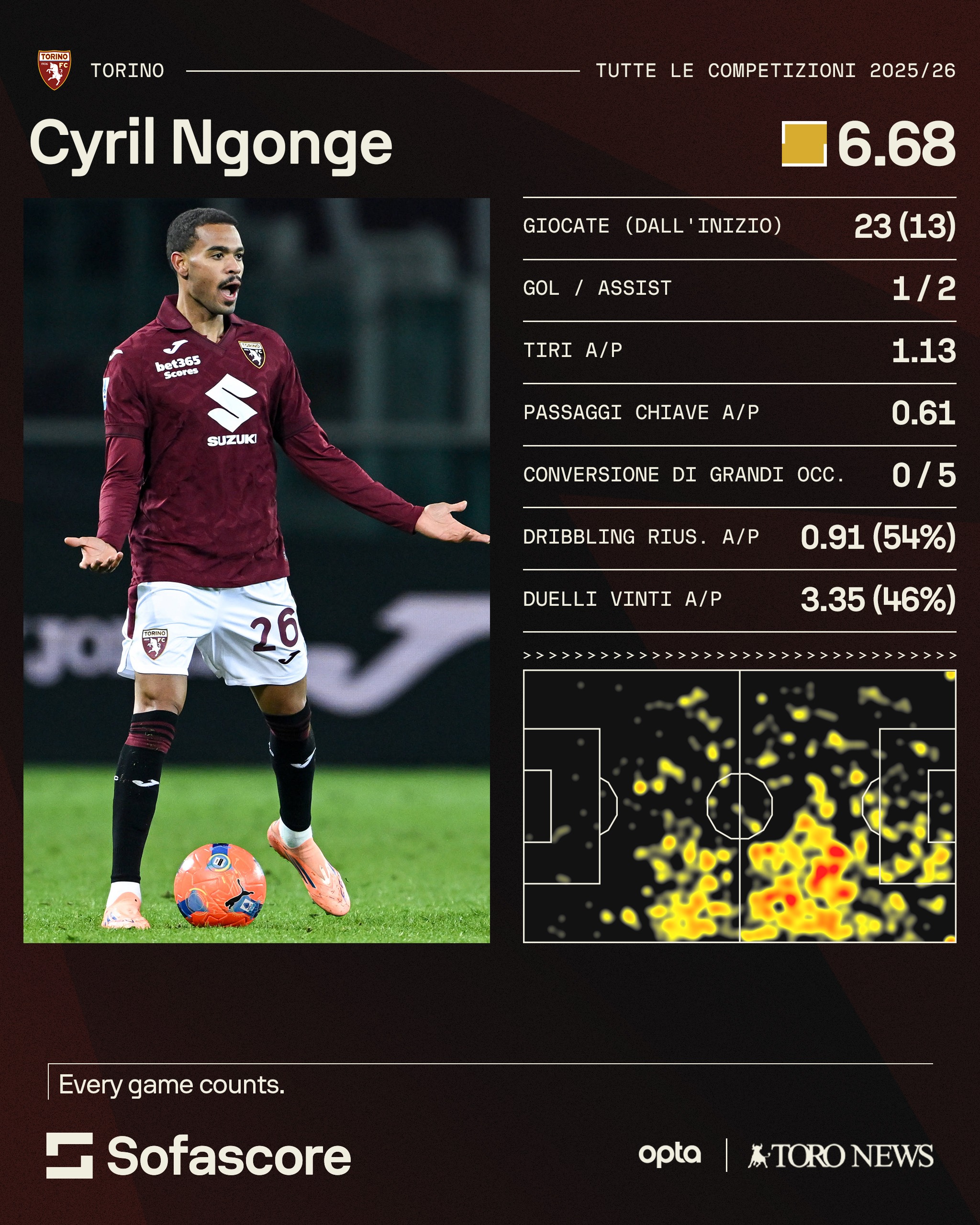 Tuttavia, come si evince dai dati di SofaScore, nel Toro non ha saputo incidere: appena 13 presenze da titolare - sommando Serie A e Coppa Italia - con un solo gol e due assist a referto. A far storcere il naso sono però anche due dati su cui ci si attendeva molto di più da uno con le qualità di Ngonge: 0,61 di passaggi chiave a partita e soltanto 0,91 di media di dribbling completati. Pesa sul conto del belga anche il fatto di avere una conversione di grandi occasioni da gol pari a 0 su 5.