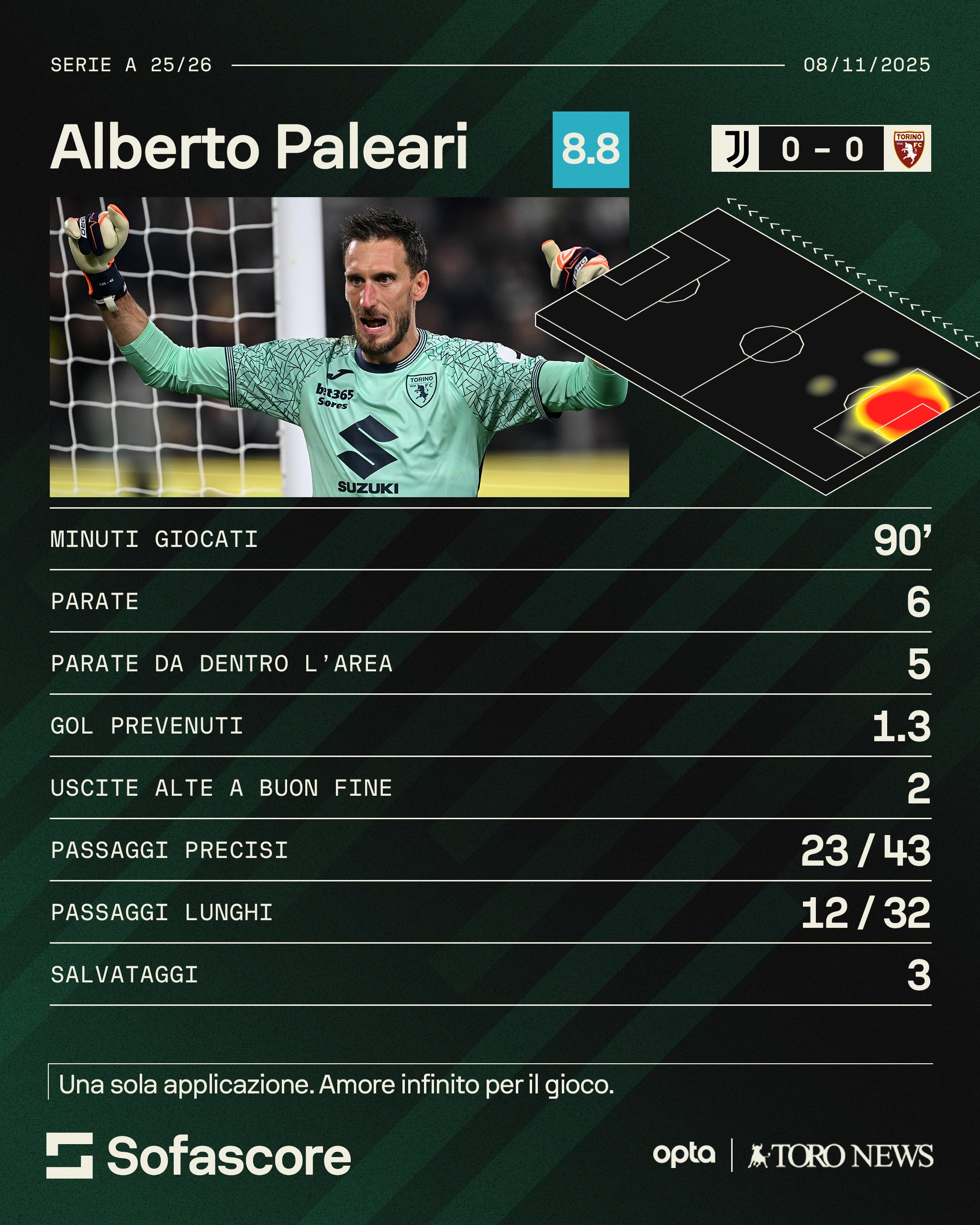 —Il premio di MVP di questo derby sul campo della Juventus non è certamente arrivato per caso perché Paleari ha saputo distinguersi tra i 22 calciatori in campo, grazie a una prestazione da applausi. Come si apprende dai dati di SofaScore, l'ex Genoa e Benevento ha raccolto ben 6 parate oltre a 3 salvataggi decisivi. Buona anche la media dei passaggi avendone completati 23 su un totale di 43 di cui 12 su 32 a lungo raggio. La Juventus ha avuto spesso il pallino del gioco in questo derby dell'undicesimo turno di Serie A ma se non è riuscita a trovare la via del gol è sicuramente anche per merito di Paleari e delle sue parate, oltre che di una prova difensiva molto buona che ha retto l'urto dell'attacco bianconero e fermato molte potenziali chance di Vlahovic e compagni.
