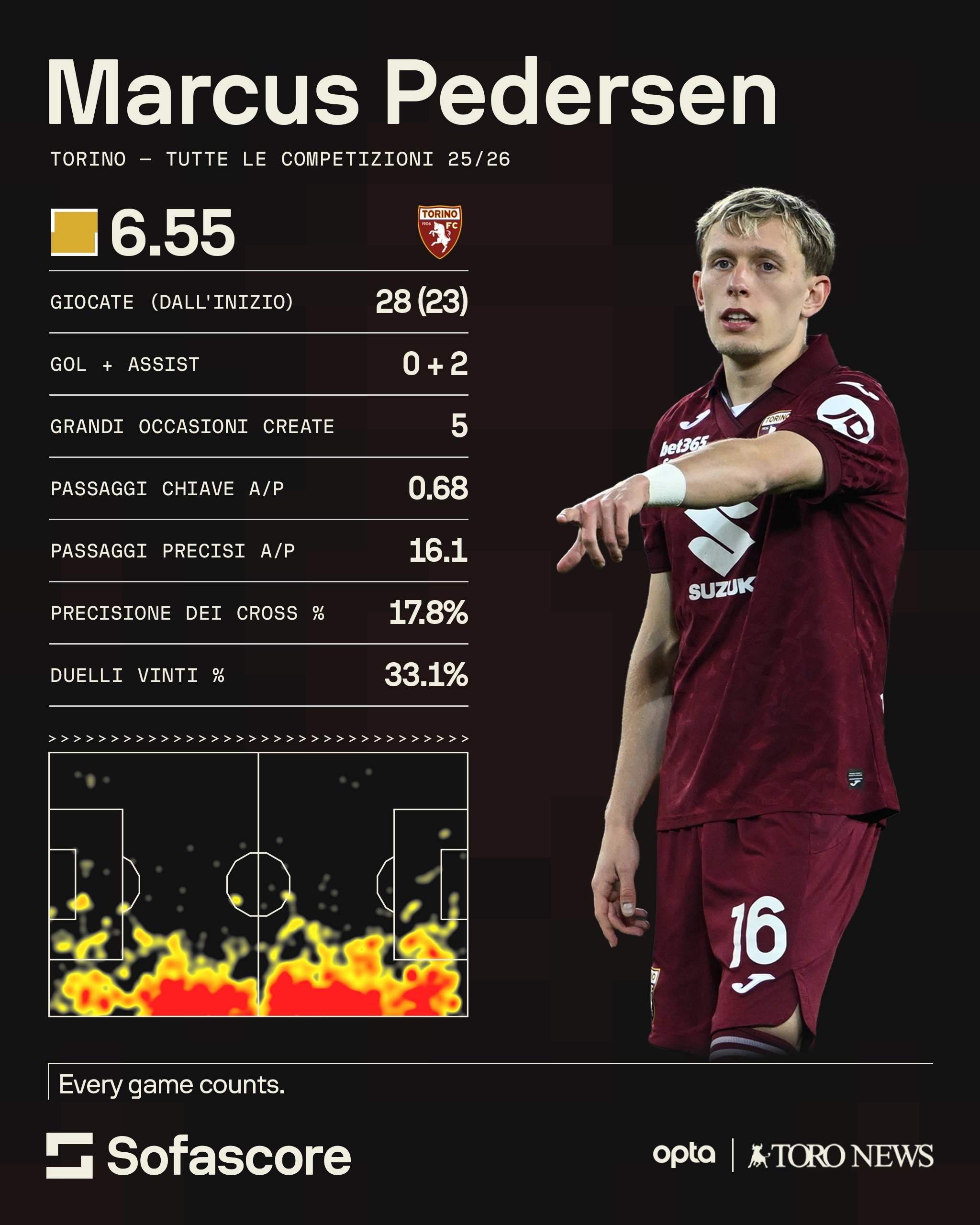 Arrivano quindi buoni segnali dal momento di forma di Pedersen che ripaga così la grande fiducia che D'Aversa gli sta ribadendo in ogni gara. L'ex tecnico di Sampdoria e Parma ha infatti schierato il suo numero 16 sempre da titolare nelle ultime quattro giornate di Serie A. Tuttavia, come si evince dai dati di SofaScore, per il norvegese del Torino è ancora importante riuscire a fare un ulteriore step di crescita per essere più concreto e determinante in fase offensiva ma anche per un miglioramento tecnico personale. L'ex Sassuolo conta infatti appena 5 grandi occasioni create in questo campionato e una media di soli 0,68 passaggi chiave per partita oltre a una percentuale solo del 17,8% di precisione dei suoi cross. Sono numeri da migliorare per un esterno che ambisce a fare il titolare in un Toro che punta molto sul gioco offensivo sviluppato dalle proprie corsi laterali.© RIPRODUZIONE RISERVATA