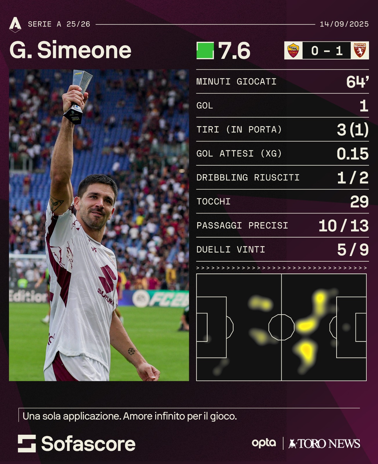 —Il gioco di squadra è il primo aspetto positivo che si può analizzare nella partita di Simeone. L'attaccante argentino, da unica punta, non si è isolato davanti, ma si è posto come obiettivo quello di legare con il centrocampo e la difesa. E questo risulta chiaro se si osserva la sua heatmap, fornita da Sofascore: i punti del campo evidenziati come i più calcati da Simeone sono già di per sé abbastanza bassi, ma alcuni arrivano nella propria metà campo e addirittura nella propria area. E questo fa da legame con il secondo aspetto: è esattamente quello che chiede Baroni. Nella scorsa stagione, alla Lazio, la coppia Castellanos-Dia permetteva ad uno dei due di staccarsi andando a ricevere molto basso e all'altro di inserirsi. Con l'impossibilità di usare il 4-2-3-1, il tecnico granata ha dovuto in parte cambiare questo aspetto, lasciando che siano gli esterni e in parte le mezzali a sfruttare gli spazi lasciati dall'attaccante. E questo è proprio il compito a cui ha adempiuto l'argentino. Il "Cholito" ha giocato una gara intelligente, pressando molto, facendosi trovare nelle posizioni giuste in caso di lanci lunghi ma sapendo anche abbassarsi molto in caso di manovra palla a terra. Contro la Roma si è mostrato come un giocatore duttile: questo potrà rivelarsi fondamentale.