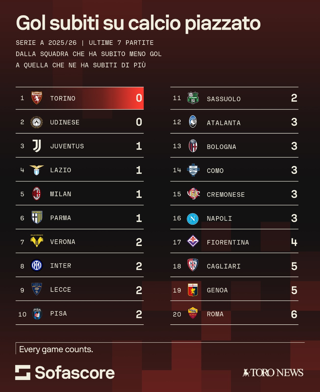 L'analisi cambia, però, se confrontiamo la stessa statistica ma soltanto nelle ultime sette gare, come potete osservare nella grafica qui sopra, fornita da Sofascore. Quello che emerge è che, sui calci piazzati, il Torino è la miglior difesa del campionato insieme all'Udinese: neanche un gol subito. Un dato che sorprende e che porta a fare dei ragionamenti. Non soltanto un terzetto difensivo ben definitivo e raramente cambiato porta risultati, ma anche la disposizione della squadra in area (difensori con aggiunti gli altri giocatori che si abbassano per dare una mano) è decisamente positiva. Alla fine, quindi, quei 9 gol sono stati incassati tutti da Baroni nelle prime 26 giornate di Serie A. La media cambia, ma alla fine del computo resta positiva: il Torino riscontra ottimi dati a riguardo.