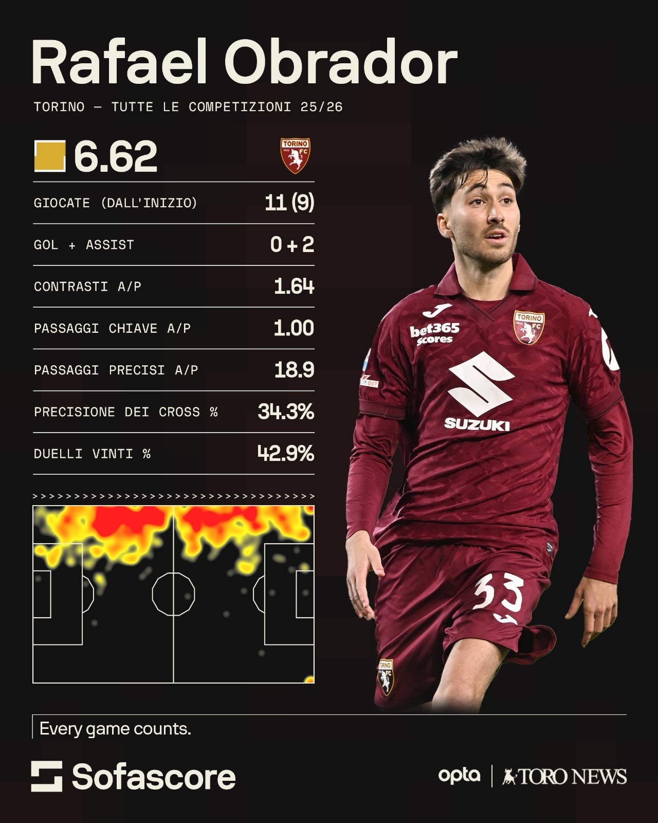 Da una fascia, all'altra. Il Torino sta trovando concretezza sulle corsie laterali, aspetto non di poco conto considerando che in passato proprio sui fianchi aveva sofferto. Pedersen con D'Aversa è nella miglior forma dall'arrivo in granata, Obrador a sinistra si sta rivelando un risorsa in poco tempo. Analizzato il rendimento del norvegese, passiamo allo spagnolo.