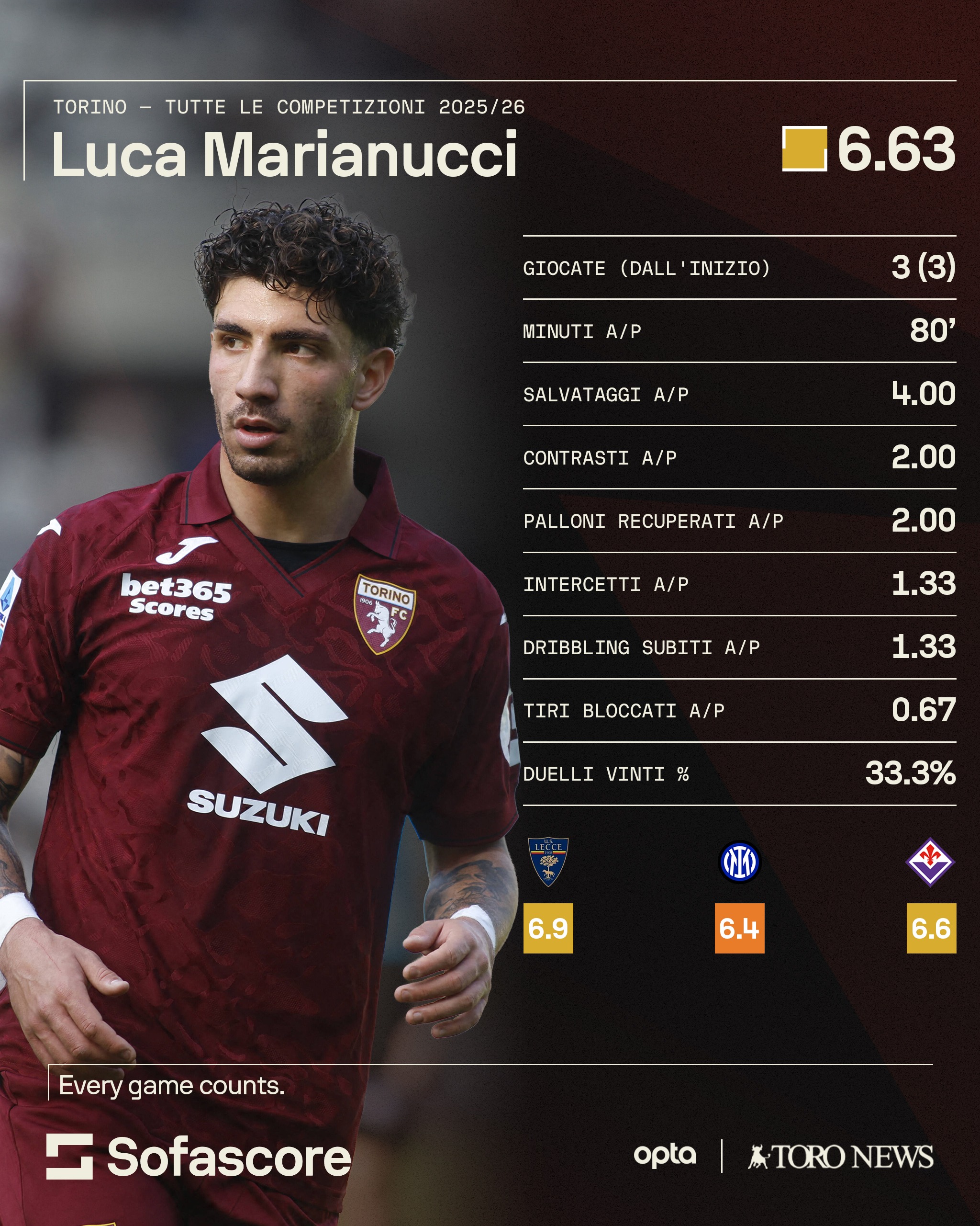 I dati forniti da SofaScore evidenziano alcuni aspetti specifici delle prestazioni di Marianucci. Il difensore classe 2004 spicca nel numero di contrasti, con una media di 2 a partita. Nel reparto arretrato di Baroni solo Maripan fa meglio in questo campo con 2.2, tutti gli altri interpreti della difesa a tre non superano la soglia dell'uno (Coco 1.7, Ismajli 1.4, Tameze 0.7). In egual modo positivo anche l'apporto in termini di salvataggi effettuati, 4 a partita. Per quanto riguarda invece gli intercetti, il rendimento di Marianucci si ferma sull'1.33 a partita. Un dato questo che lo mette in perfetta linea con tutti gli altri centrali e braccetti a disposizione di Baroni. L'ultimo elemento è infine relativo ai duelli vinti a partita, il 33%. Questa statistica indica un'area in cui il difensore granata può migliorare, considerando la riuscita di solo un terzo dei duelli in cui è coinvolto. Piccoli nei a parte, tanti elementi mostrano un Marianucci a livello dei compagni appena trovati a Torino. Baroni potrà farne tesoro.© RIPRODUZIONE RISERVATA