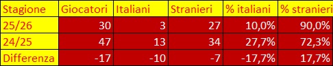 —E anche rispetto alla scorsa stagione si nota un peggioramento. Il dato è certamente influenzato dal fatto che, nel corso della stagione, sono entrati in rosa tanti giocatori diversi e che, inevitabilmente, quelli che vi prendono parte a tratti sono tendenzialmente delle giovanili e quindi statisticamente in prevalenza italiani. Analizzando comunque il dato si vede, però, una diminuzione di quasi il 18% degli italiani, con il conseguente aumento della stessa percentuale sul numero di stranieri. Il confronto tra questi dati, come detto, lascia un po' il tempo che trova e andrà analizzato meglio alla fine di questa stagione, quando altri prodotti del settore giovanile (probabilmente italiani, anche se comunque non è certa come previsione) avranno potuto partecipare a questa Serie A 2025/2026 o alla Coppa Italia.