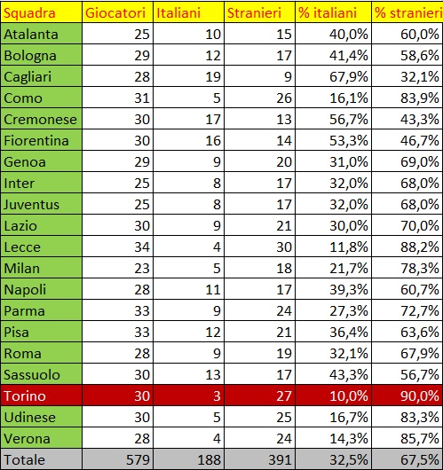 —Osservando la tabella, i cui dati sono certamente destinati a cambiare - anche se in minima parte - quando saranno comunicate ufficialmente le liste dei 25, si nota da subito come siano pochissime le squadre che possono vantare una maggioranza di italiani. Sono solo 3 queste squadre: Cagliari, Cremonese e Fiorentina. Tutte le altre hanno una maggioranza di stranieri, ma il Torino più di tutte. La formazione di Marco Baroni si presenta con il 90% (27 su 30) di giocatori stranieri, mentre sono soltanto 3 gli italiani: Paleari, Biraghi e Casadei. In valore assoluto non è la prima per stranieri, con il Lecce che ne ha addirittura 30, con la differenza, però, che i salentini ne hanno 30 su una totalità i 34 (per una percentuale pari all'88,2%), mentre i granata arrivano al 90%. Allo stesso modo, quindi, con il 10% di italiani in rosa il Torino è l'ultima squadra in Serie A sulla base di questo dato, con il Lecce che rimane secondo con l'11,8%. Dati non positivi, in generale, per la Serie A: su 579 giocatori soltanto il 32,5% di questi sono italiani, per un totale di 391 giocatori stranieri. I recenti risultati negativi della Nazionale azzurra sono senza dubbio da imputare anche a questo.