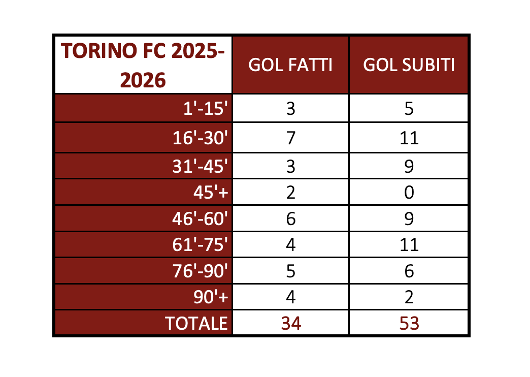 Guardando la distribuzione delle reti, il secondo tempo è complessivamente più "pesante" del primo: 15 gol segnati e 25 subiti nei primi 45’, 19 fatti e 29 concessi nella ripresa. Nel dettaglio, il momento più caldo arriva tra il 16’ e il 30’: è lì che il Torino produce di più ma allo stesso tempo concede tantissimo, con 7 gol segnati e 11 subiti. Ancora peggio la parte finale del primo tempo (31’-45’), dove il bilancio è nettamente negativo: 3 gol fatti e 9 subiti. Curioso invece il recupero del primo tempo, fin qui positivo: 2 gol segnati e nessuno incassato.