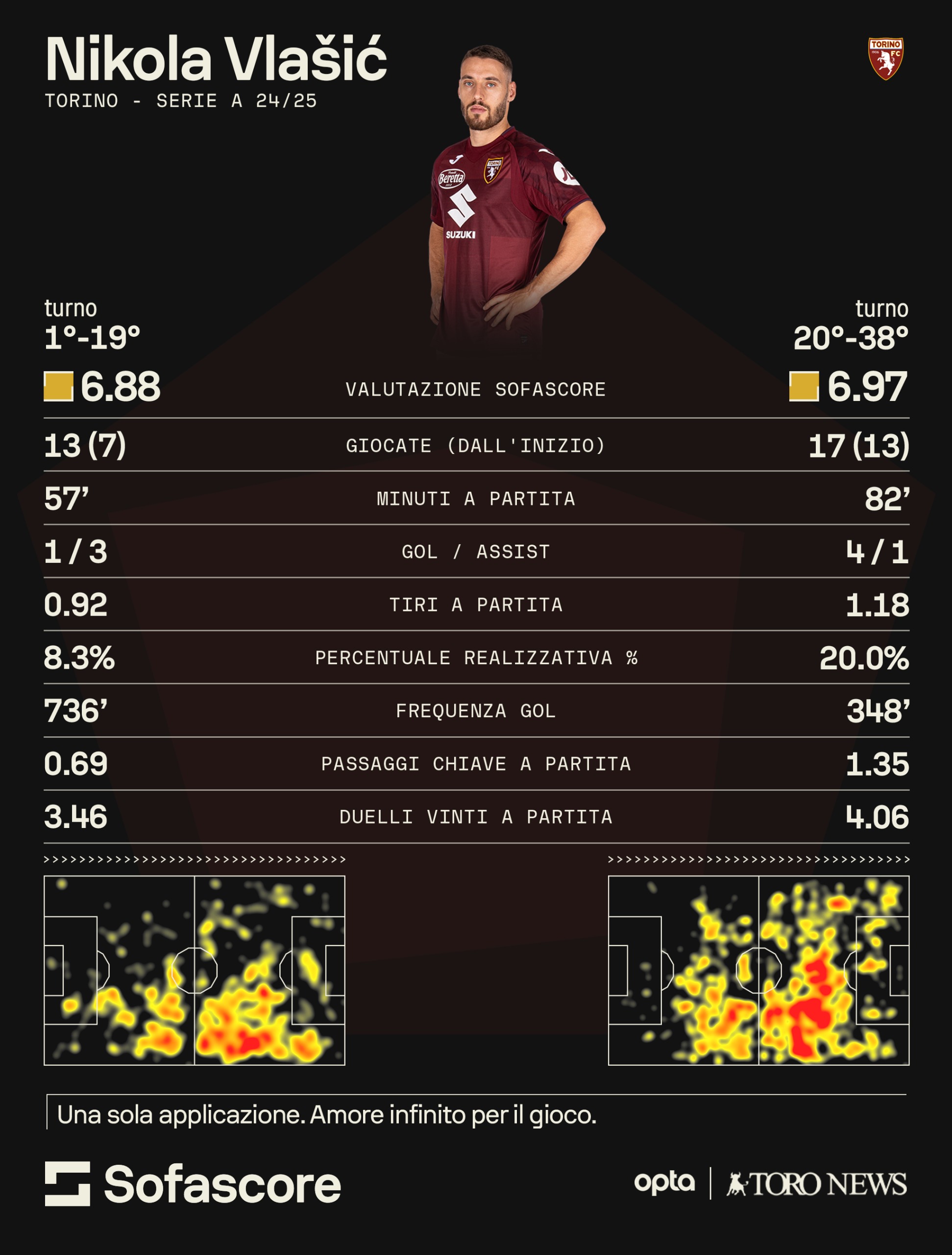 Come detto, quello a Prato allo Stelvio, programmato nelle date 14-26 luglio, sarà il primo ritiro granata per Nikola Vlasic. Questo fattore può fare la differenza. In 3 stagioni, 102 presenze, 13 gol e 14 assist, il trequartista croato ha dimostrato che, se in condizione fisica e se messo in condizione tattica, in campo può fare veramente la differenza. Il croato è un giocatore in grado di unire centrocampo e attacco, di dare estro e qualità ma al tempo stesso di utilizzare il fisico e dare sostanza, spesso supportando anche la manovra difensiva. È un giocatore completo, che, tuttavia, dalla sua non ha una grandissima duttilità. Ha dimostrato di saper giocare anche come esterno e come mezzala, è vero, ma nulla a che vedere con le prestazioni fornite come trequartista centrale. La grafica (fornita da Sofascore) mostra i dati di Vlasic nella prima metà del campionato, cioè quando il Torino giocava con la difesa a 3 e il croato era costretto ad adattarsi mezzala, e nella seconda, quando Vanoli ha attuato il passaggio al 4-2-3-1 e il conseguente posizionamento di Vlasic come trequartista centrale. Il miglioramento è netto ed evidente: Vlasic è passato da 1 gol e 3 assist in 13 partite (poco più del 50% da titolare) a 4 gol e 1 assist in 17 (76% da titolare). 1,18 tiri a partita contro lo 0,92 fatto risultare in precedenza, 20% di percentuale realizzativa contro l'8,3%, gol ogni 348 minuti anziché 736, 1,35 passaggi chiave a match invece di 0,69 e 4,06 duelli vinti a partita contro i 3,46 della prima metà di campionato. Sembra di parlare di giocatori diversi, eppure la differenza è stata fatta dal posizionamento del croato. Questo ben sottolinea quanto Vlasic sia un giocatore che ha bisogno di essere messo in campo nel modo giusto. A ciò si aggiunge che il numero 10 granata è anche soggetto a infortuni: in 3 stagioni all'ombra della Mole, il croato ne ha subiti 8, stando fermo una totalità di 199 giorni e saltando 24 partite tra club e Nazionale. Cominciare la preparazione estiva nello stesso club in cui si andrà a giocare la stagione e soprattutto cominciarla con ampio anticipo può fare la differenza da quest'ultimo punto di vista, fisico, ma anche da un punto di vista tattico: Vlasic avrà la possibilità di comprendere al meglio le idee di Baroni e prepararsi alle richieste tattiche che lo attenderanno nella stagione. Il croato fa la differenza se sta bene fisicamente e tatticamente. Il ritiro può cambiare tutto. Vlasic, ci sono le basi: il momento per la consacrazione è questo.