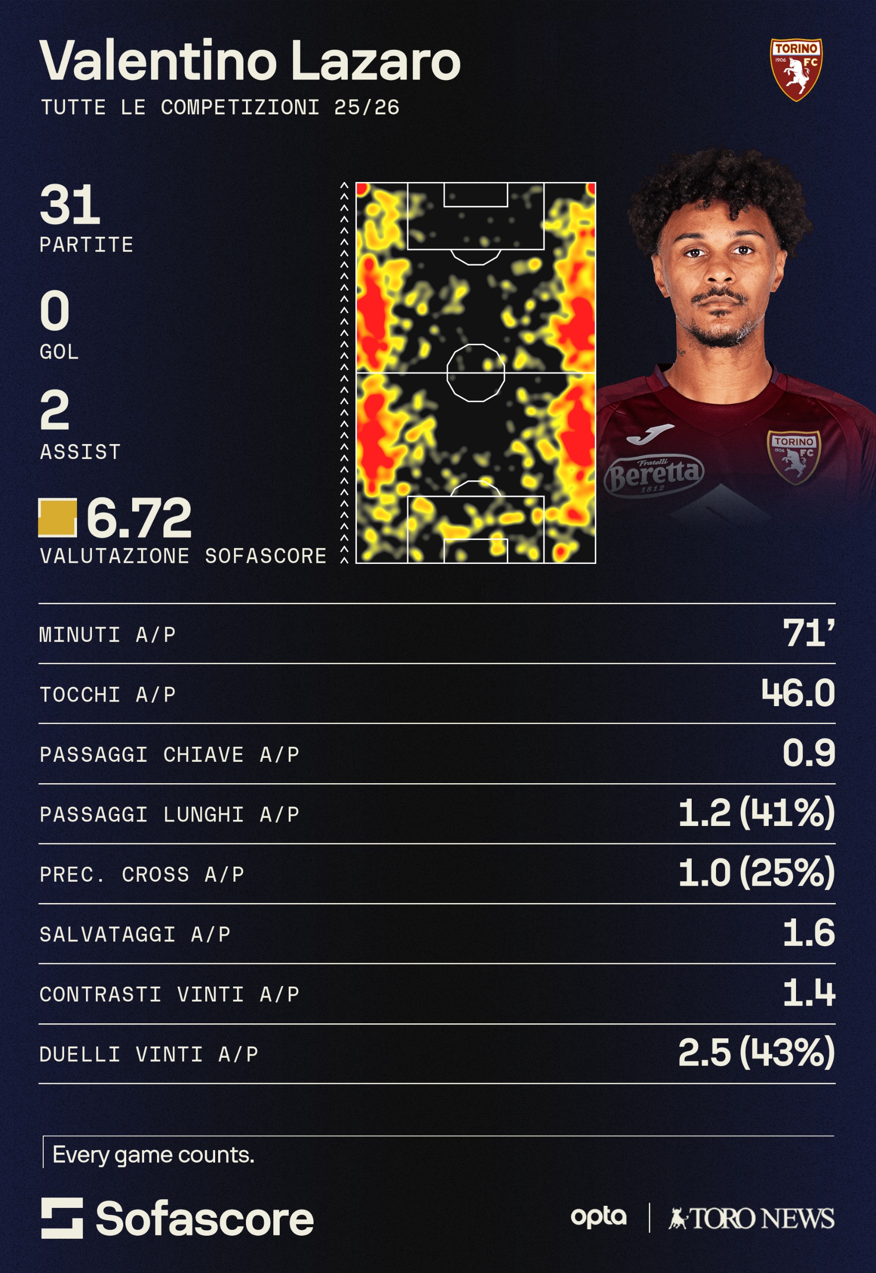 Come si evince dai dati di SofaScore, la prestazione di Lazaro racconta di due duelli vinti su quattro e di un solo cross giusto su cinque tentati. L'ex Inter e Benfica ha però anche perso ben 16 palloni in questo match e questo è un dato che pesa. La scorsa partita in casa contro la Lazio, (la prima con D'Aversa in panchina) Lazaro era riuscito a portare a termine una discreta prestazione soprattutto in fase offensiva con alcuni cross insidiosi per la difesa biancoceleste. Potrebbe essere stato anche questo a convincere il nuovo allenatore granata a confermare pure il numero 20 nel suo undici che è rimasto identico tra le sfide con Lazio e Napoli.