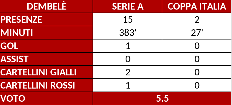 Tra le partite peggiori giocate dall'esterno ivoriano c'è senza dubbio il match contro la Fiorentina. La gara non era iniziata così male, con il giocatore che aveva anche approcciato la sfida in maniera propositiva e creando anche una buona occasione con un bel cross per Tameze, che aveva colpito troppo centralmente però nell'occasione. Qui però viene fuori l'immaturità del giocatore, che compie due falli inutili nel giro di cinque minuti. Troppa voglia di fare e di farsi notare, di mettersi in luce. Troppa foga e due gialli che costano caro. Il primo al 27' su Gosens, il secondo al 33' su Folorunsho. Era l'esordio da titolare, lo bagna nel peggiore dei modi.Dembelè, il pagellone di fine stagione: il voto