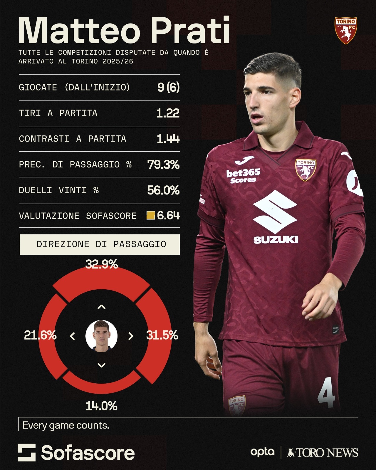 Per ora, il suo contributo offensivo è nullo (0 gol, assist e tiri in porta), nonostante un dato di 1.72 tiri nei 90 minuti. Manca però di reale pericolosità. Nulla di nuovo rispetto alla prima parte di stagione al Cagliari, dove aveva fatto registrare un solo tiro in porta su 19 tentativi. Non è questa la sua caratteristica principale.Il dato più significativo riguarda dunque il suo coinvolgimento nella costruzione. Da quando è al Torino, Prati si attesta su circa 23 passaggi a partita (fonte: WhoScored), un volume piuttosto contenuto per un centrocampista centrale. Inoltre, emerge un approccio perlopiù conservativo: 16.5 passaggi corti completati a partita contro 1.6 lunghi, con una precisione del 79.3% (fonte: Sofascore). Tende dunque a giocare semplice, senza forzare la giocata, ma senza essere ancora un punto di riferimento nella costruzione. Dati che non differiscono molto da quelli del Cagliari, dove viaggiava a 27.6 passaggi a partita, pur mantenendo uno stile poco rischioso. Al momento, sembra essere cambiata soprattutto la centralità e il peso all’interno dell’undici. Anche in fase di non possesso il suo impatto è limitato: 2 intercetti e 2 contrasti vinti (fonte: FBref) in oltre 400 minuti. A Cagliari, con un minutaggio più elevato (1268 minuti, 15 partite da titolare), aveva prodotto numeri più consistenti: 15 intercetti e 12 contrasti vinti. La tendenza sul rendimento del giocatore si è riflessa anche a Pisa. Prati è rimasto in campo per 62 minuti, completando il 71% dei passaggi (22 su 31): un volume in linea con la sua media stagionale, ma con una precisione leggermente inferiore rispetto al suo standard (79%, fonte Sofascore). Il dato più interessante riguarda però la partecipazione nei duelli: 7 quelli vinti, di cui 5 a terra. In questo caso, una presenza più attiva rispetto alle medie stagionali. Ma siamo ancora lontani da una vera centralità nel gioco.