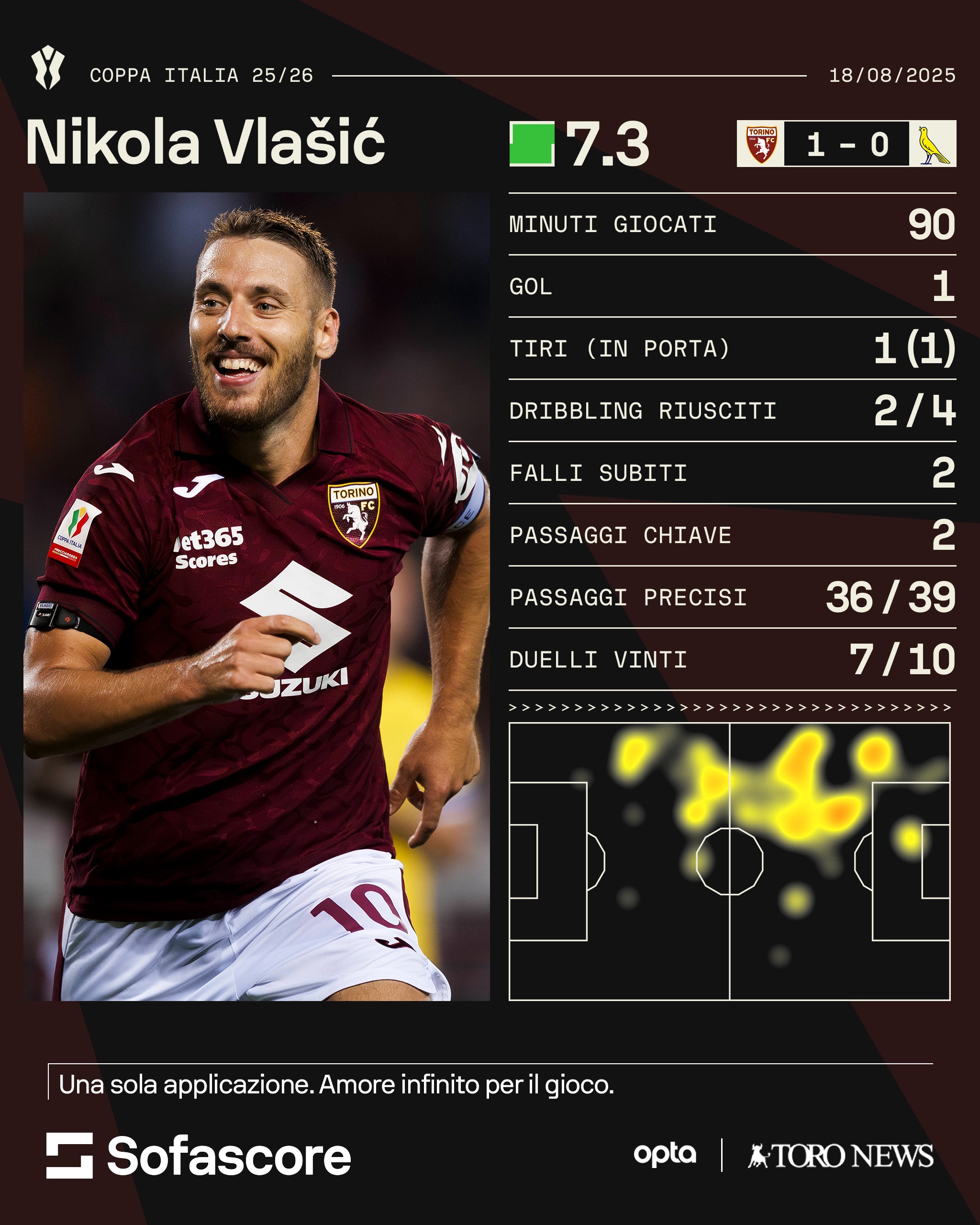 —Se il Torino è riuscito a superare un'avversario di una categoria inferiore come il Modena è stato grazie al gol di Nikola Vlasic che dati alla mano è stato uno dei granata migliori in questo debutto in Coppa Italia. Come si evince da Sofascore, il trequartista croato ha saputo completare anche 2 dribbling e fornire 2 passaggi chiave contro l'avversario emiliano che milita in Serie B. Per il tecnico granata Marco Baroni - che è intervenuto in conferenza stampa alla vigilia di questa delicata sfida contro l'Inter - sono poi certamente lodevoli anche altri due numeri di tutto rispetto: Vlasic contro il Modena ha saputo avere un'elevata precisione nei passaggi, con 36 passaggi completati su 39 e ha vinto ben 7 duelli su un totale di 10.