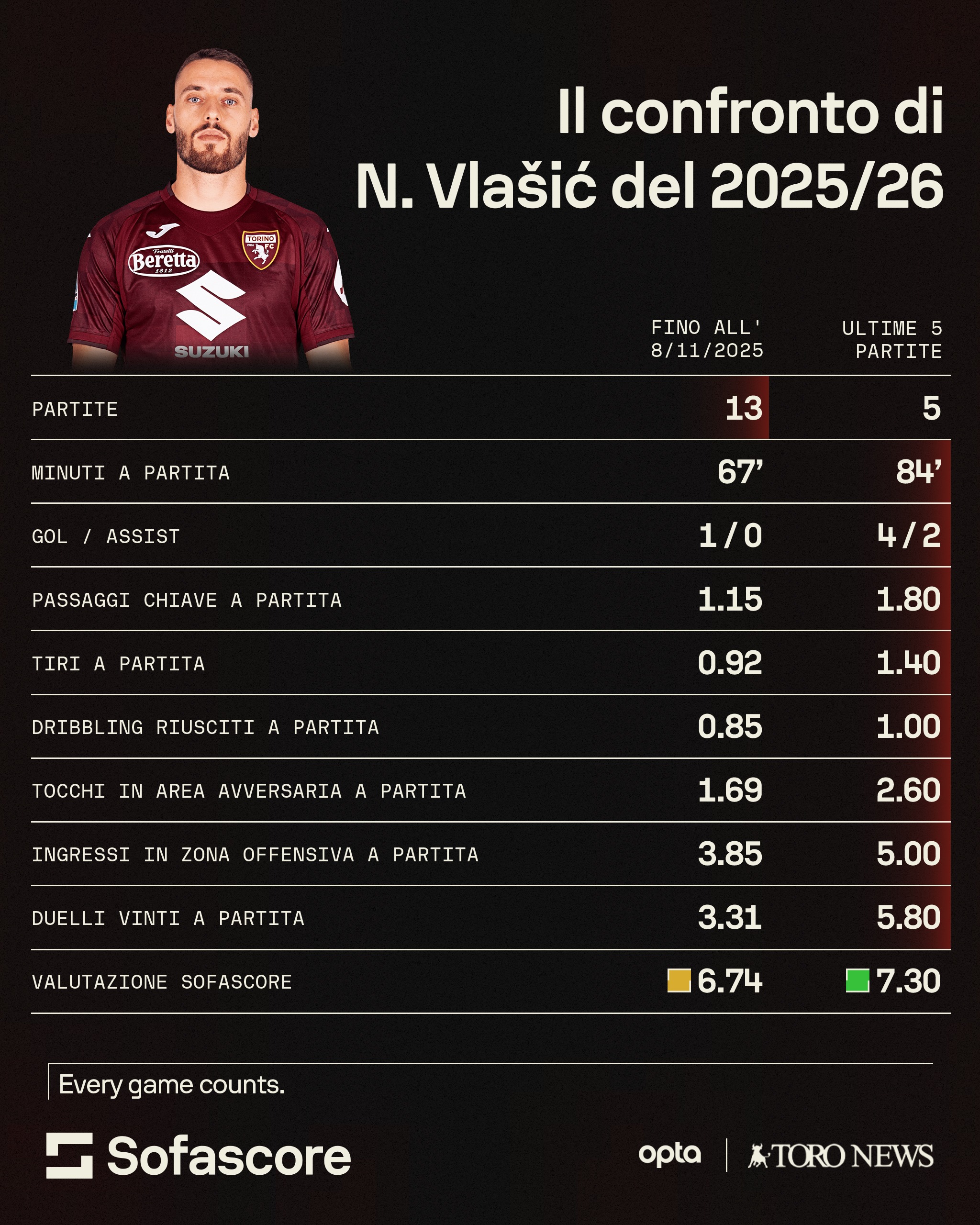 —Solo Lautaro come lui. Una frase che potrebbe risultare blasfema o esagerata, ma se si considerano le ultime cinque partite, è la verità. Contro Como e Lecce sono arrivate due sconfitte pesanti, non solo come risultato ma anche per il morale, e anche contro il Milan la rimonta ha lasciato l'amaro in bocca. Eppure Vlasic è riuscito comunque a fare buone prestazioni. A maggior ragione con Cremonese e Sassuolo, sfide in cui il Toro ha portato a casa il bottino pieno, il croato si è proposto come giocatore chiave delle prestazioni granata. A fare clamore, soprattutto, è la partecipazione ai gol. Prima del 24 novembre, Vlasic in maglia granata aveva partecipato soltanto a una marcatura: la rete alla prima stagionale contro il Modena, in Coppa Italia. Dopo, zero gol e zero assist. Nelle ultime cinque, invece, sono sei le partecipazioni ai gol: rete contro il Como, assist contro il Lecce, gol e assist contro il Milan, gol contro Cremonese e Sassuolo. 4 gol e 2 assist nelle ultime 5: un risultato eccezionale, eguagliato dal solo Lautaro in Serie A. E in effetti, anche gli altri dati - come evidenziato dalla grafica fornita da SofaScore -, sono in crescita: i passaggi chiave a partita passano da 1.15 a 1.80, i tiri da 0.92 a 1.30, i tocchi in area avversaria da 1.69 a 2.60 e gli ingressi in zona offensiva addirittura da 3.85 a 5. Una crescita esponenziale che ha visto Nikola Vlasic diventare un giocatore fenomenale nelle ultime cinque partite in granata.