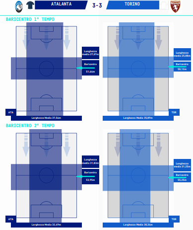 STRATEGIA – Entrambe le squadre non si sono sbilanciate più di tanto, hanno mantenuto il loro baricentro per quasi tutti la durata della partita intorno alla metà campo. Soprattutto nei secondi 45' di gioco, il Torino ha alzato maggiormente la pressione e giocato un maggior numero di palloni. Questo risulta leggermente più evidente analizzando i dati sull’altezza media del baricentro di Atalanta e Torino. Nella prima frazione di gioco la Dea si è mantenuta sui 51,66 metri, rimanendo nei pressi della metà campo. Mentre la squadra di Davide Nicola si è stabilita sui 50,12 metri, poco al di sotto della linea di metà campo. Il baricentro di entrambe le squadre - maggiormente quello del Torino - è aumentato nel secondo tempo: 53,95 metri per la formazione di Gian Piero Gasperini, contro i 55,25 metri dei granata. L'aumentare del baricentro della squadra di Davide Nicola nella seconda frazione di gioco evidenzia l'impegno e le maggiori conclusioni pericolose create dal Torino per trovare il gol del pareggio.