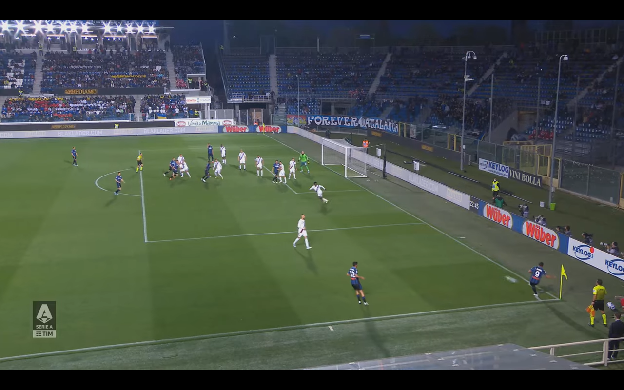 L'azione che porta l'Atalanta in vantaggio nell'unico spezzone di gara arriva al minuto 23. La Dea segna grazie ad uno schema su calcio d'angolo. Ad incaricarsi della battuta del corner è Muriel. Come si può notare nell'immagine 1, i giocatori del Toro sono tutti schiacciati negli ultimi 15 metri e quelli dell'Atalanta fuori dall'area hanno molto spazio.
