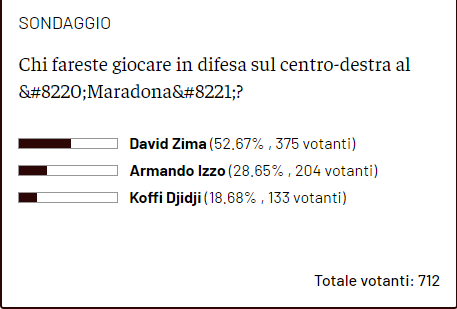 In vista del Napoli sono diversi i dubbi di formazione in casa Toro, specialmente in difesa, dove sono in tre a contendersi il posto da titolare al fianco di Bremer e (probabilmente) Rodriguez: Djidji, Izzo e Zima. Tutti e tre hanno caratteristiche e motivazioni valide per essere inseriti dal primo minuto, ma solo uno verrà scelto da Juric. Nel frattempo, in attesa di scoprire la decisione definitiva del tecnico croato, abbiamo voluto chiedere a voi lettori chi fareste giocare domani al Maradona. Dai risultati del sondaggio è emerso che per il 52% dei votanti è David Zima l'uomo giusto da schierare alla destra di Bremer. Mentre gli altri due rimangono molto lontani dal ceco a livello di percentuali: Izzo infatti sarebbe la scelta del 28% dei lettori, Djidji del 18%.