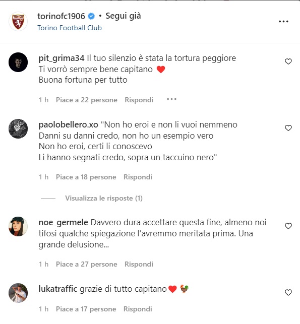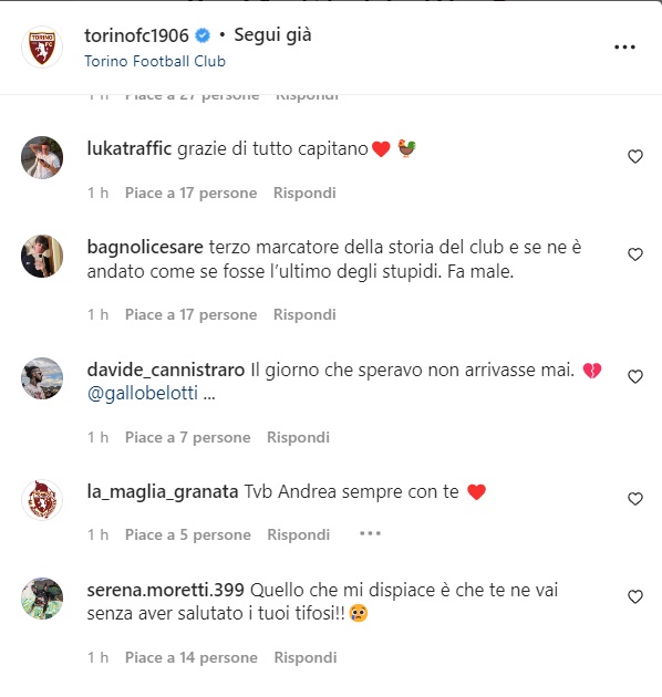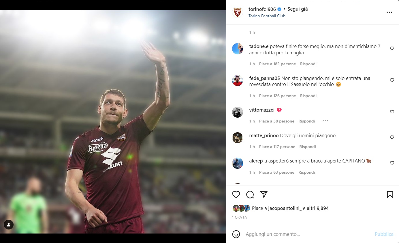 Il Torino ha annunciato l'addio di Andrea Belotti. Il Gallo, dopo 7 anni, non è più un calciatore granata. La società, per omaggiare il lungo cammino del giocatore, gli ha dedicato un video e un comunicato ufficiale, che è stato anche postato sui vari account social del club. Ciò che Belotti ha fatto per il Toro resterà per sempre nella storia del club e nei ricordi dei tifosi, che nei commenti hanno espresso la loro opinione, densa di sentimenti contrastanti. Da una parte c'è la volontà di ringraziare il Gallo per tutto ciò che ha fatto e per ciò che ha significato, ma dall'altra c'è del rammarico per quel che riguarda l'epilogo della vicenda.