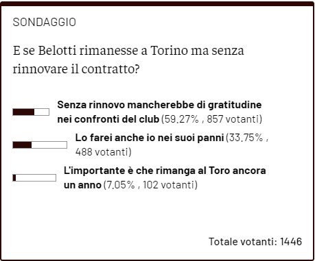 I risultati della consultazione parlano chiaro: per la maggioranza dei votanti (59,27%) la decisione di rimanere senza rinnovare sarebbe una mancanza di gratitudine nei confronti di una società che l'ha fatto crescere calcisticamente e che gli ha permesso di entrare con costanza nel giro della Nazionale, perché esporrebbe il club alla possibilità di perdere il suo giocatore più importante a costo zero. Una consistente e non trascurabile minoranza (33,75%) però, si immedesima nel Capitano e ritiene che al suo posto farebbe la stessa cosa, aspettando così di capire che tipo di ambizioni può avere questo Toro, prima di legarsi al club per molti anni. Infine, il 7,05% dei votanti si farebbe bastare che il Gallo resti al Toro ancora un anno, per la sua settima stagione in granata, a prescindere dalla firma o meno sul rinnovo di contratto.